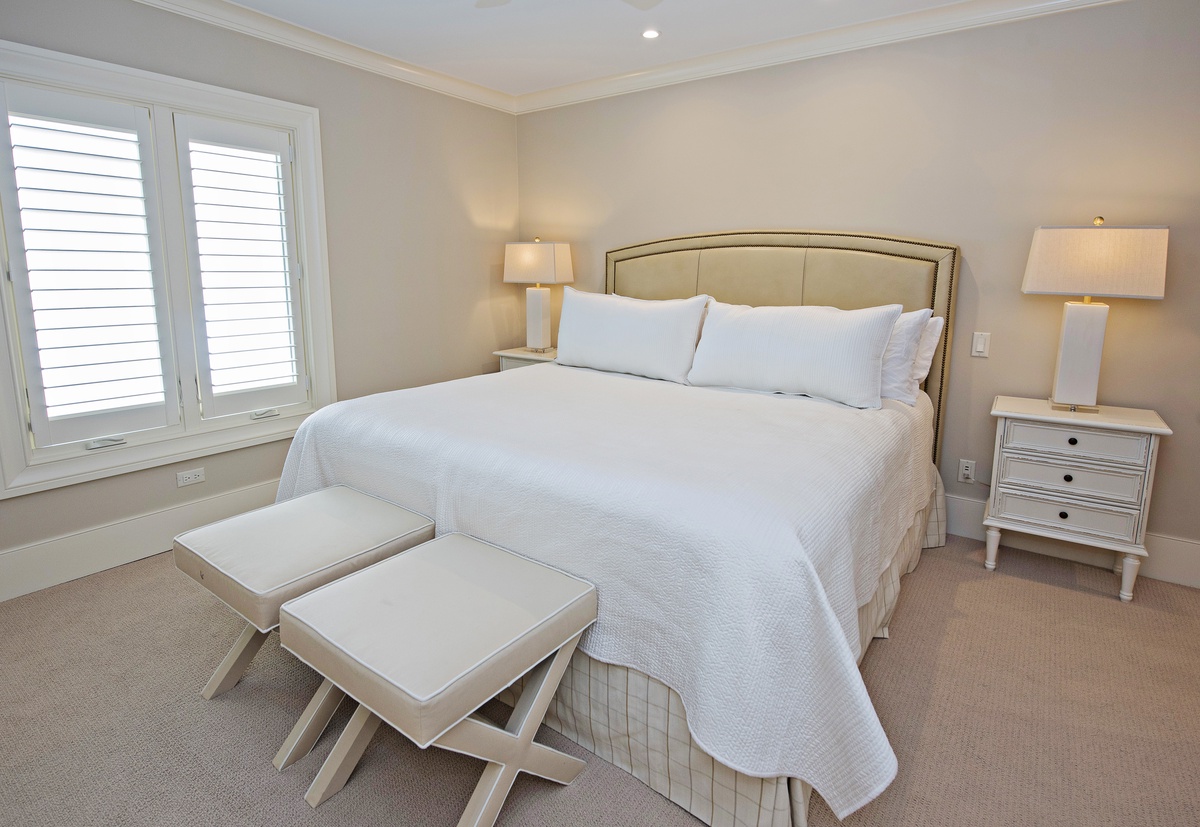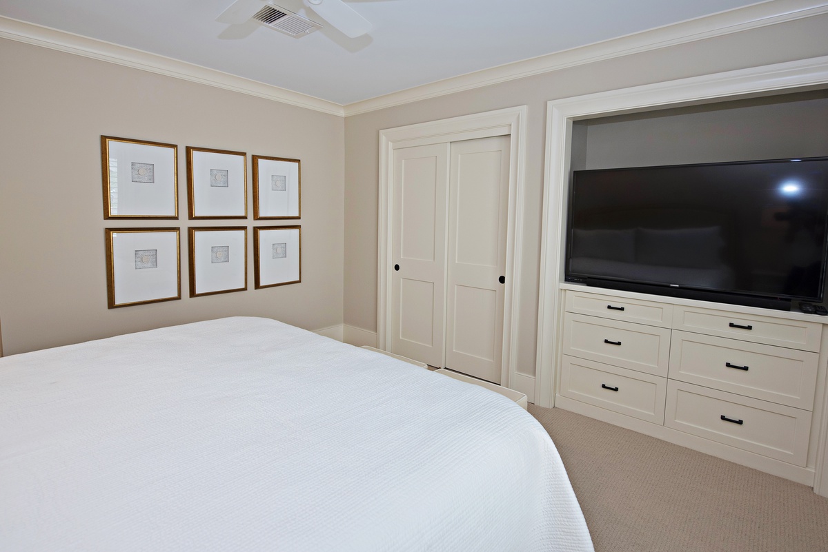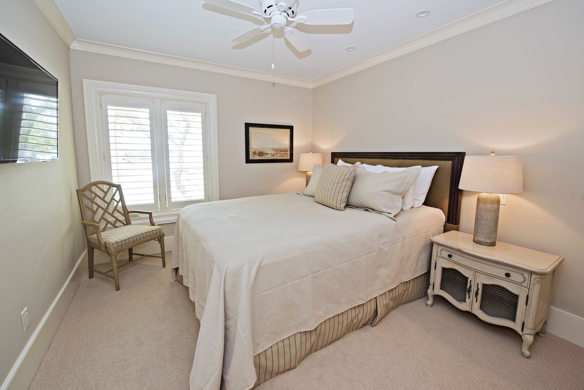 Finally, the master suite employs an inspired color scheme to lend modern flair to a space with a king-size bed, wall-mounted flat-screen TV, Liberty Oak views through dual plantation shuttered windows, and richly spacious en suite with granite-topped single-basin vanity and spacious walk-in shower.
