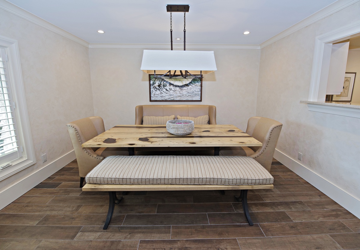 Luxuriously modern embellishments continue in the main dining space, with its reclamation-style dining table offering ample seating thanks to a wide bench seat. In the kitchen, craftsman-style cabinetry, stainless-steel KitchenAid appliances, built-in coffee maker and wide quartz counters are among the many upgrades that have transformed this space. A nearby washer and dryer is set off from the kitchen for convenience.