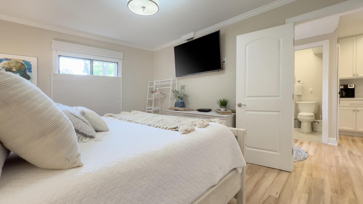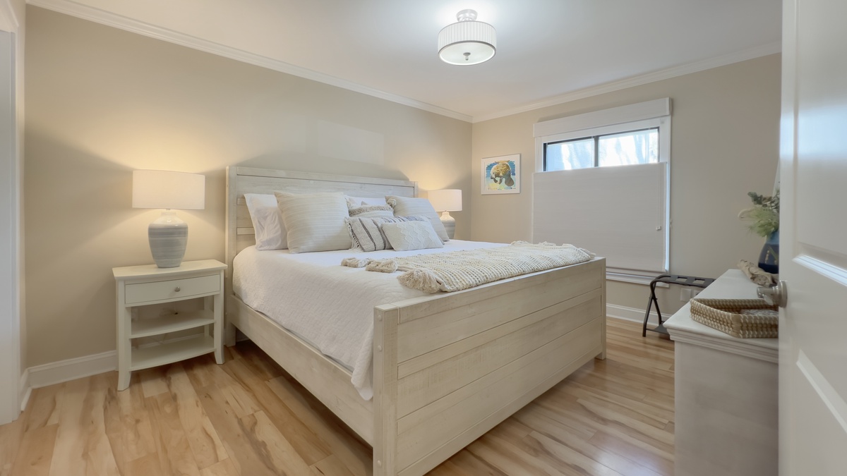 The master suite indulges with high-end comforts including a plush king-size bed as well as tall windows, flat-screen TV and private en suite bath whose cavernous walk-in shower boasts dual showerheads.