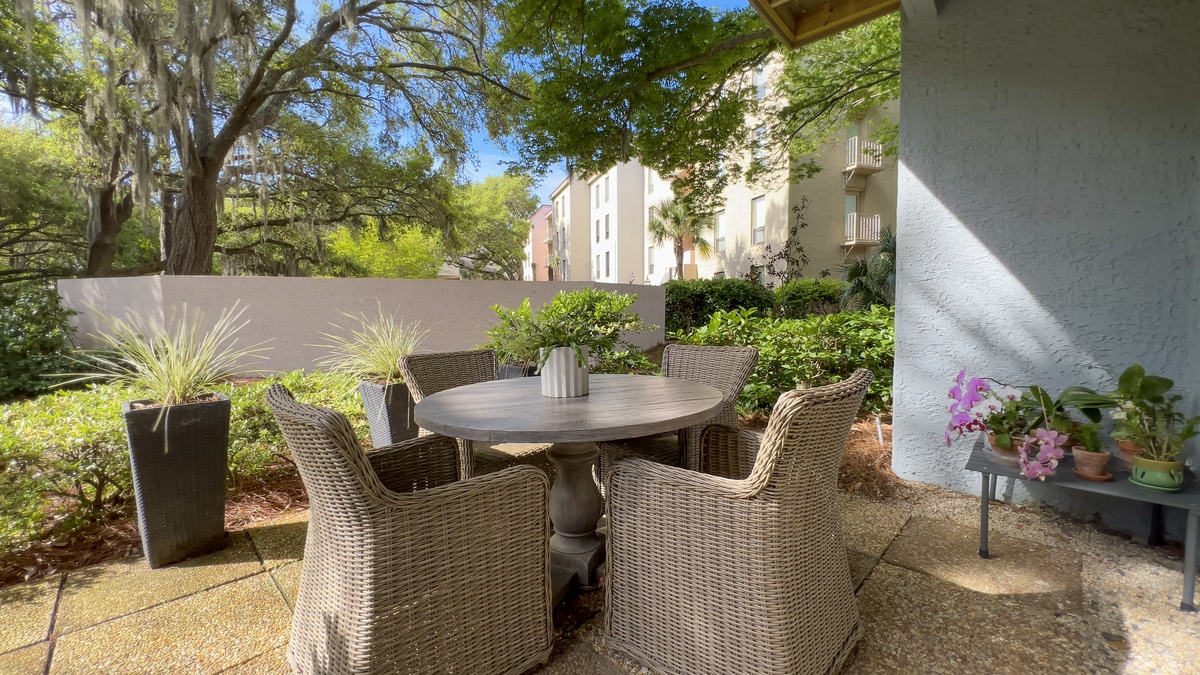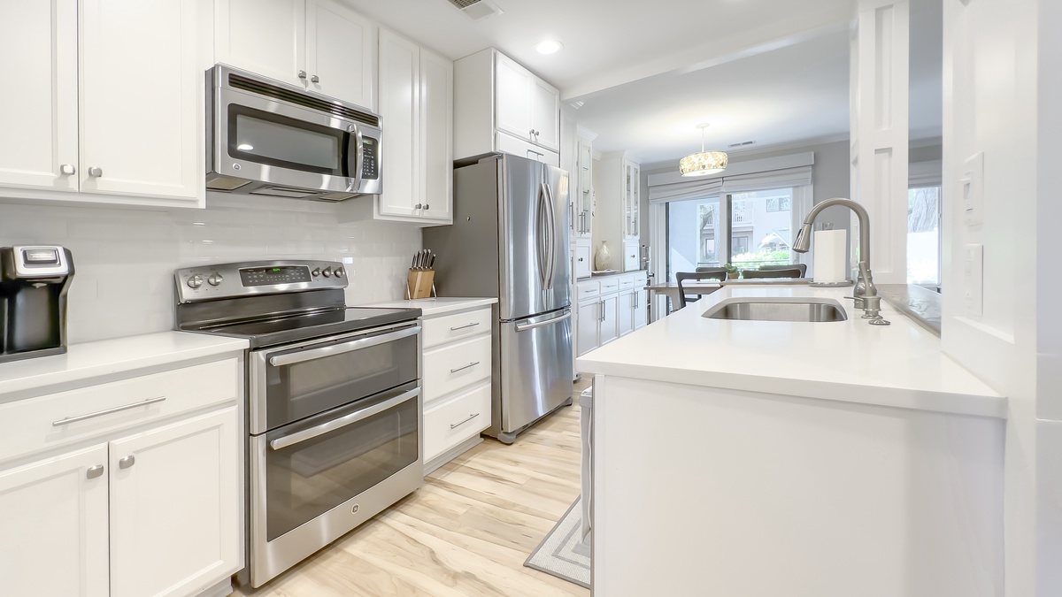 Skillful renovations have created a lush sense of space in the main living areas, with the galley kitchen opened up to allow for amazing flow. Here, solid surface counters surround a full suite of gourmet appliances, including flat-cooktop stove and dual ovens. Nearby, an elegant dining table offers seating for four before a set of eye-catching built-ins and a wall of sliding glass. Step beyond, and you’re immersed in a tranquil outdoor oasis with sun-dappled al fresco dining for four and dazzling views of Harbour Town.