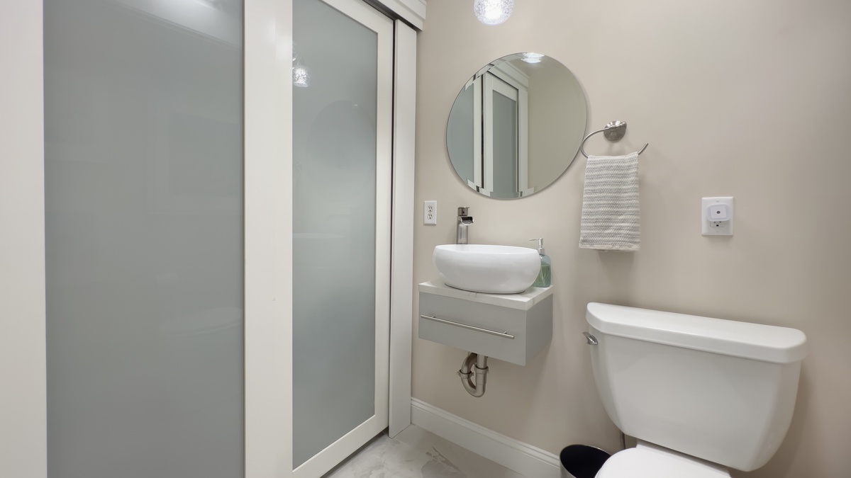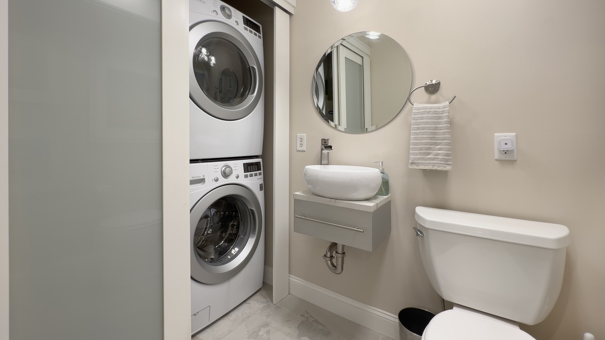 Inside, a grand living room sees a pair of sofas set amid lush natural light from windows on two walls, enjoying the beauty of a decorative fireplace. Explore the villa and you’ll also find an updated powder room set behind frosted glass and a full washer and dryer for all the convenience of home.