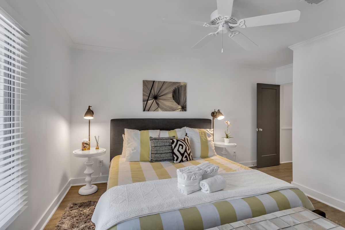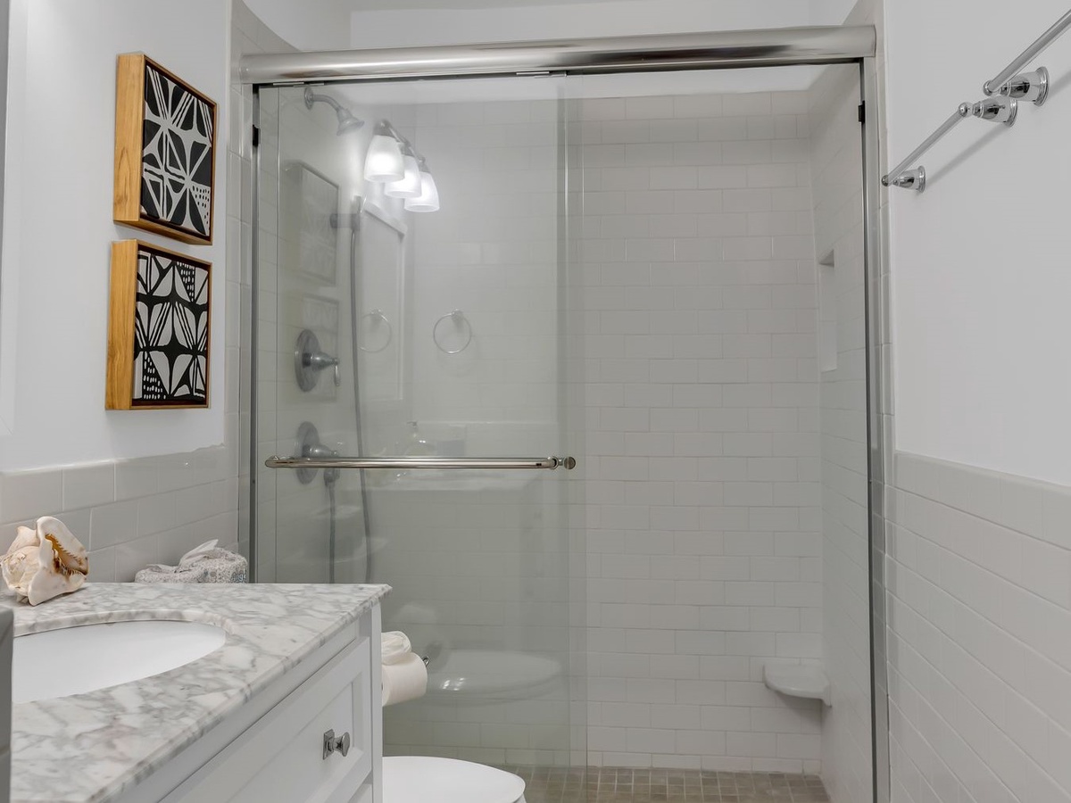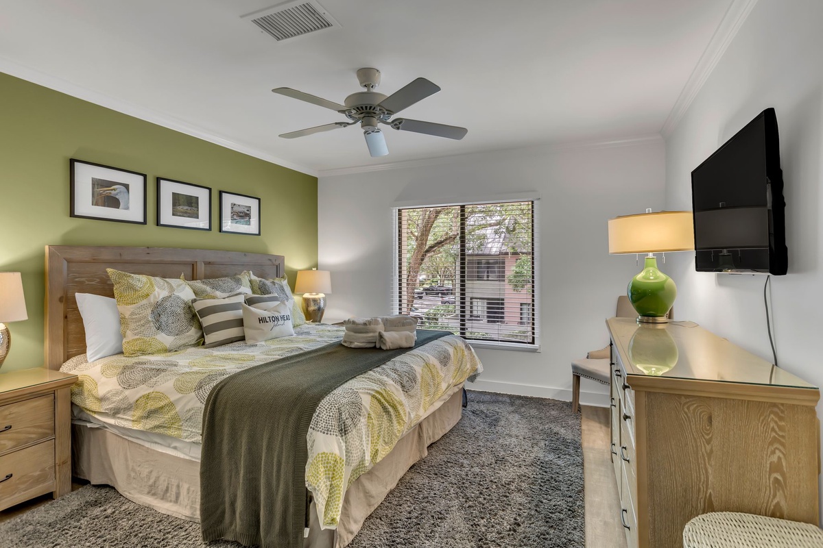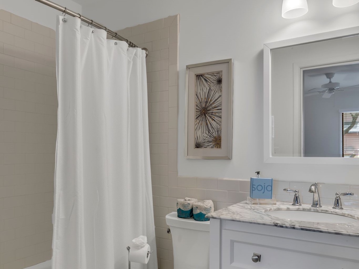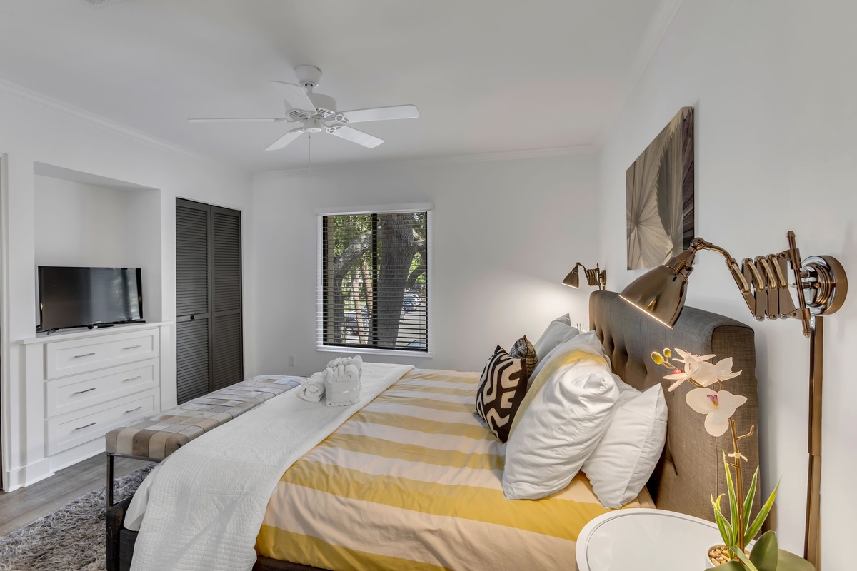 In addition to a first-floor powder room and discrete washer and dryer, this villa’s homey comforts include three spacious suites. Two of them, either of which could serve as the primary suite, each enjoy a king size bed beneath a ceiling fan, with flat-screen TV and en suite bath with walk-in shower. The third suite, infused with a delightful bohemian flair, offers two twin beds, a ceiling fan, flat-screen TV and en suite bath with tub and shower.