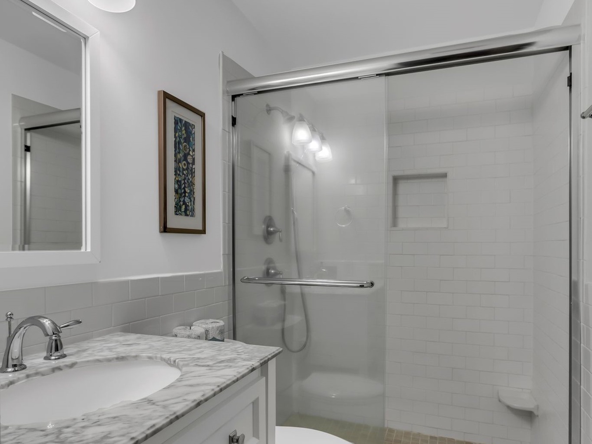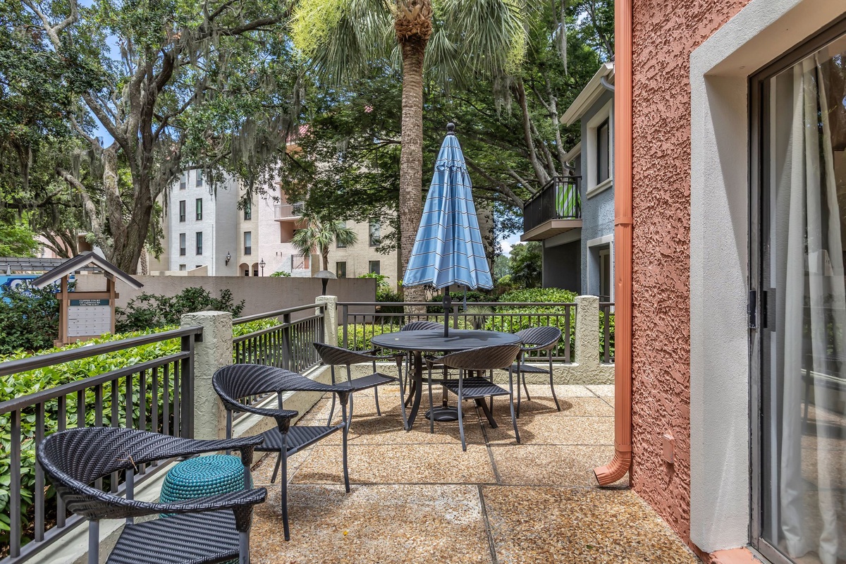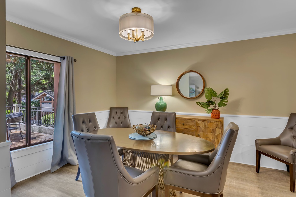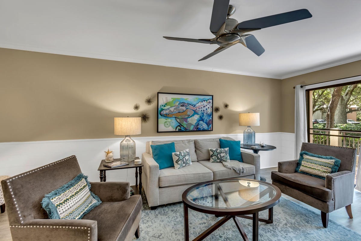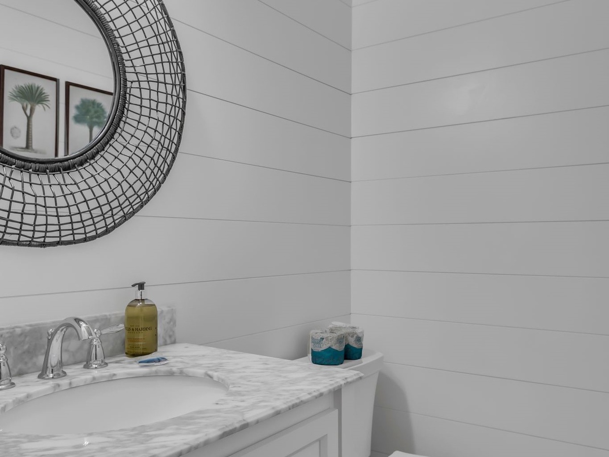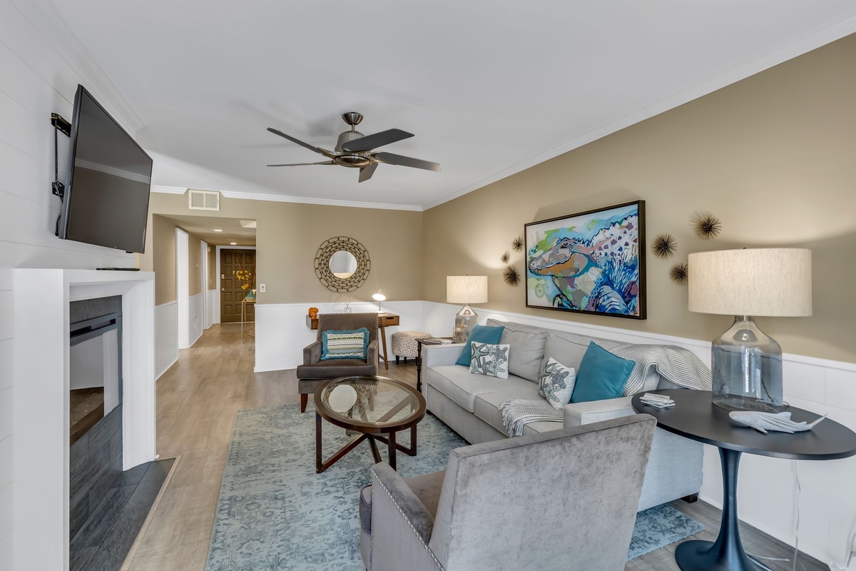 The shiplap accents and wainscotting of the great room evoke classic Southern finery, surrounding a space with sofa and armchairs facing a decorative fireplace and flat-screen TV. Sliders in this room open wide to let sea breezes in, guiding you out to the expansive patio with al fresco dining for four beneath an umbrella.