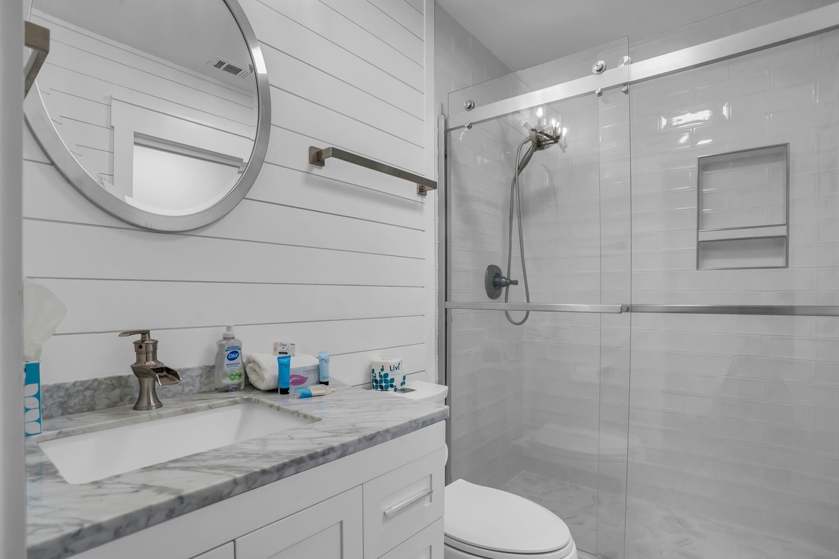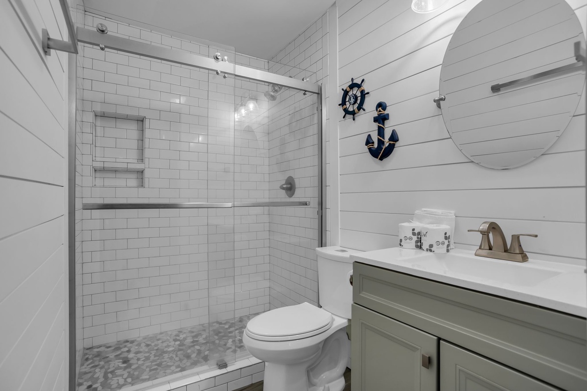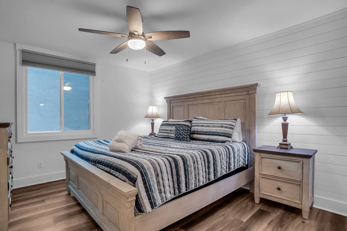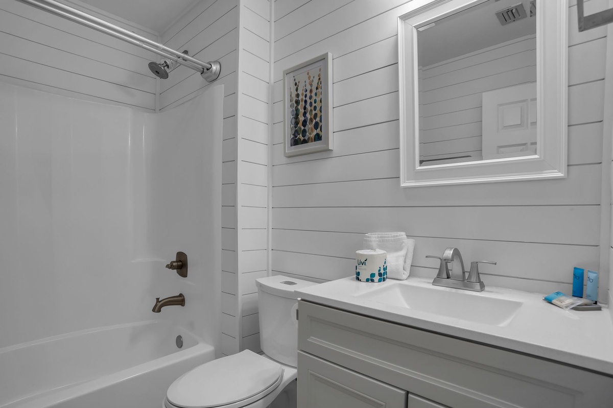 Two king beds, swing king (can be made into two twin beds) and a queen sleeper sofa, sleeps eight. Additionally, each bedroom possesses its own en suite, complete with tiled showers in king bedrooms and a refinished shower/tub in the swing king bedroom. Combining the shiplap in the downstairs master bedroom and all of the bathrooms with the tasteful decor throughout the villa, we have no doubt that you will fall in love with this villa and consider making it your home-away-from-home for years to come.