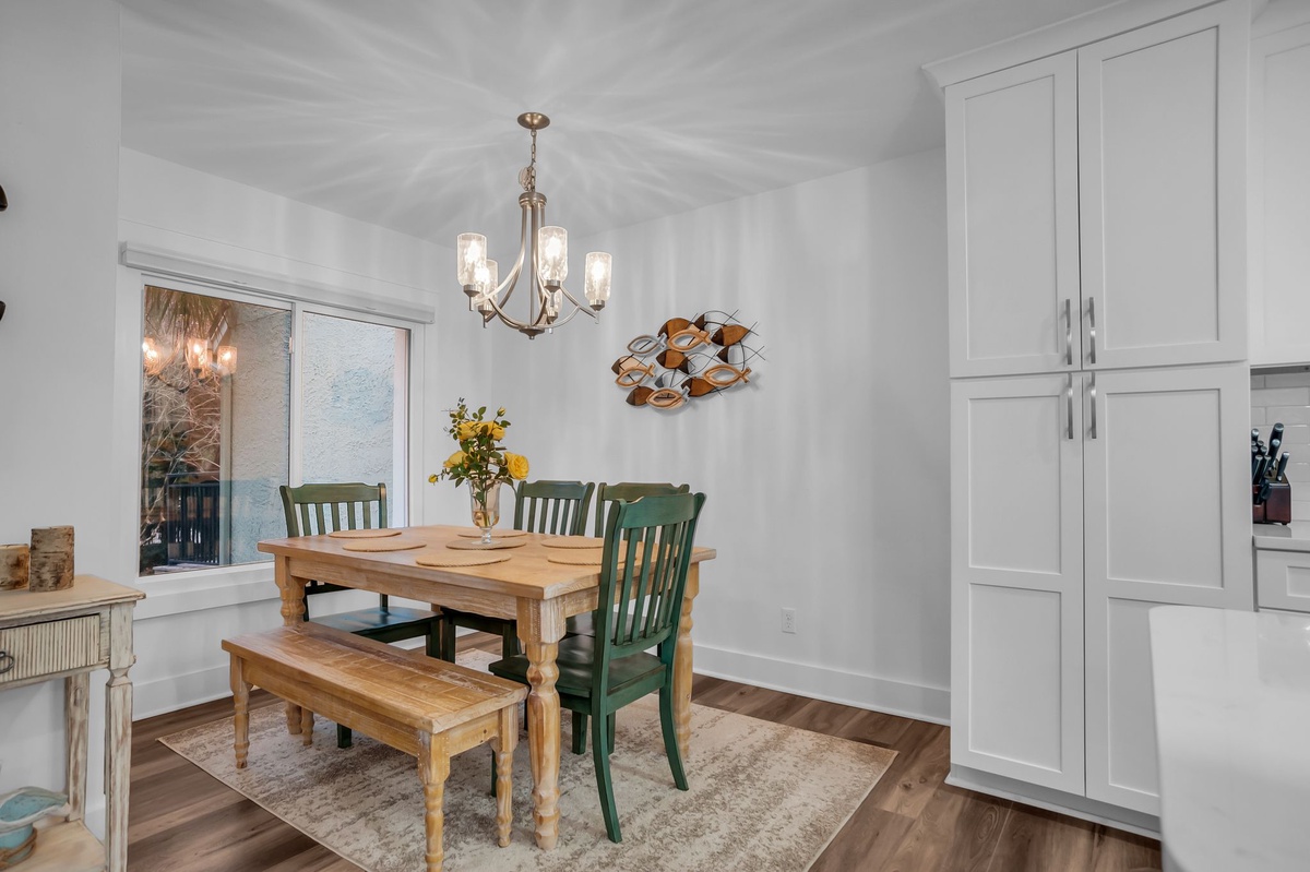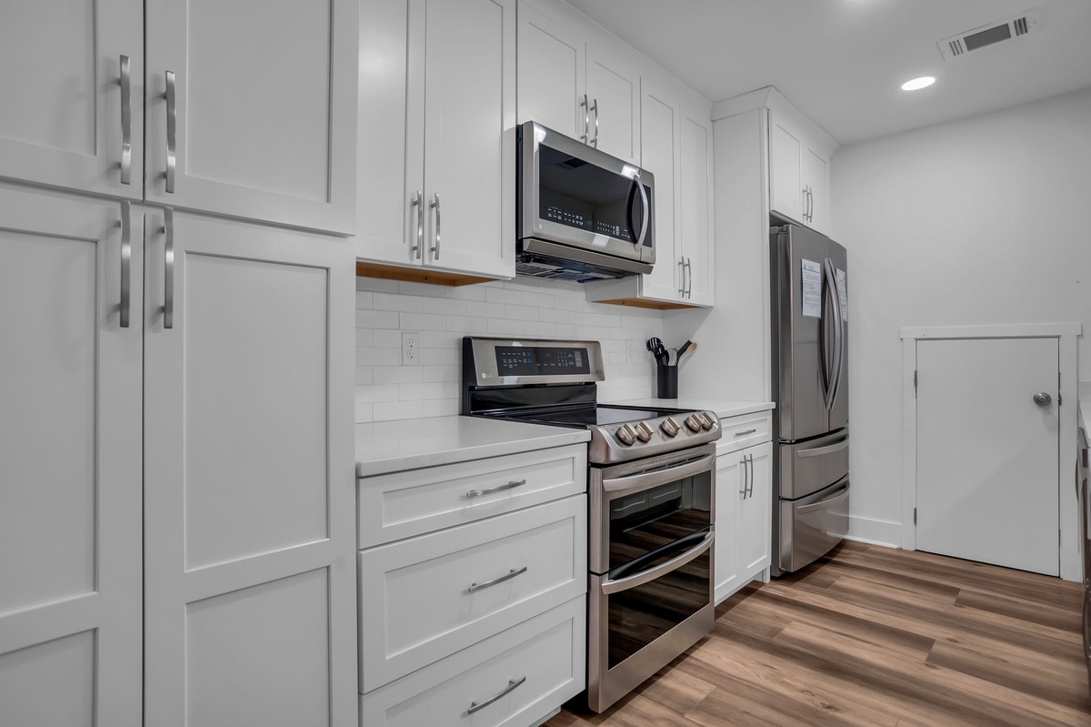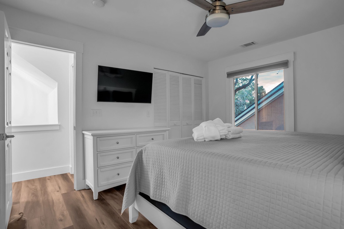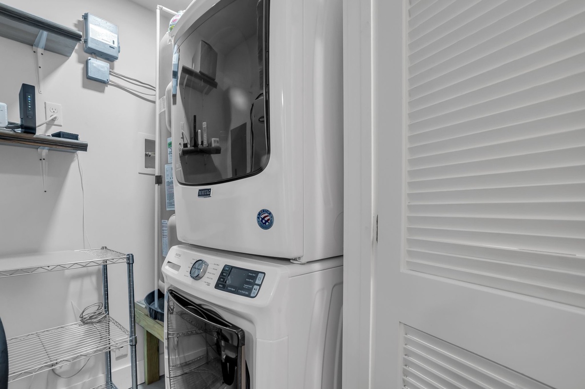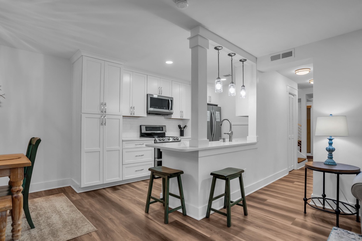 Stepping inside, you will be welcomed into an open entryway lined with luxury vinyl plank flooring and an elegant staircase to the upstairs bedrooms. As you walk down the hallway, you will experience a warmth that stems from the natural light from the large living room and kitchen windows. The living area flows into the elegant and comfortable kitchen. When you take a break from the wonderful cuisines of the countless local restaurants, you will have access to the fully equipped kitchen with all the luxuries of your kitchen at home; the kitchen features stainless steel appliances, quartz countertops, a farmhouse sink, and more. In keeping with the contemporary ambiance of the space is a stacked full-size washer and dryer, as well as smart TVs contribute to the aesthetic of modern functionality and comfort that permeates the entire villa.