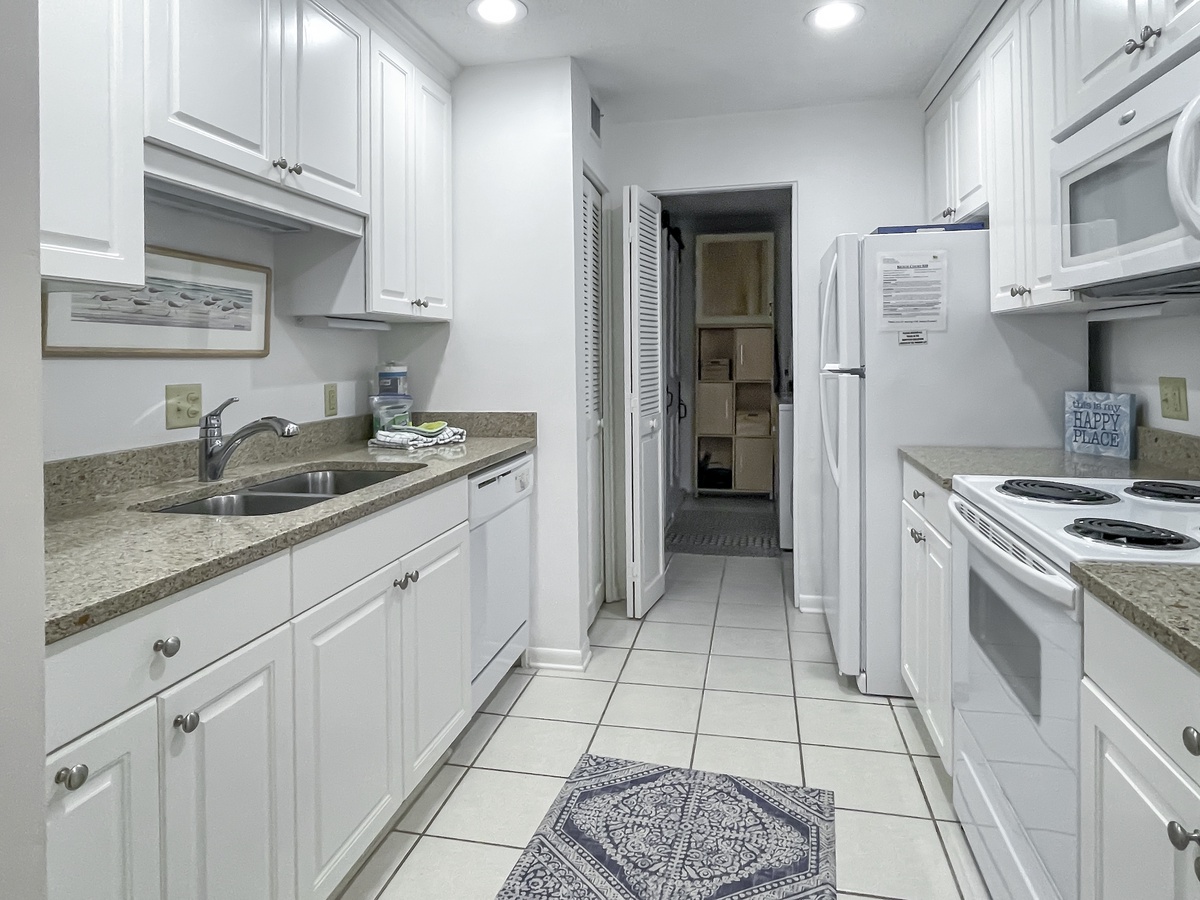 The open living space exults in natural light from walls of sliding glass, illuminating a comfortable conversation area with sofa and loveseat facing a flat-screen TV. To the other side a delightful dining area offers seating for four convenient to the kitchen, with its granite counters and full suite of appliances. A nearby laundry rounds out the homey conveniences.