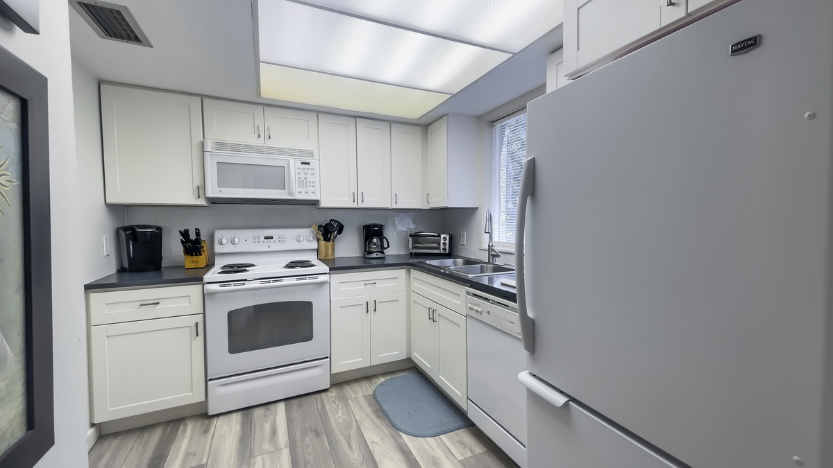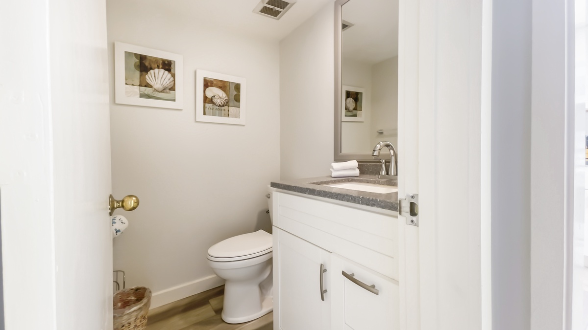 The main living space incorporates full family and dining spaces. Ringed by four woven grass chairs and flanked by a granite sidebar, the glass-top dining table brings the whole group together. Just beyond, the spacious living room sees a sleeper sofa and dual armchairs in chic coastal taupe facing a flat-screen TV. A wall of sliding glass to one side gives way to a tranquil outdoor space with al fresco dining for four.