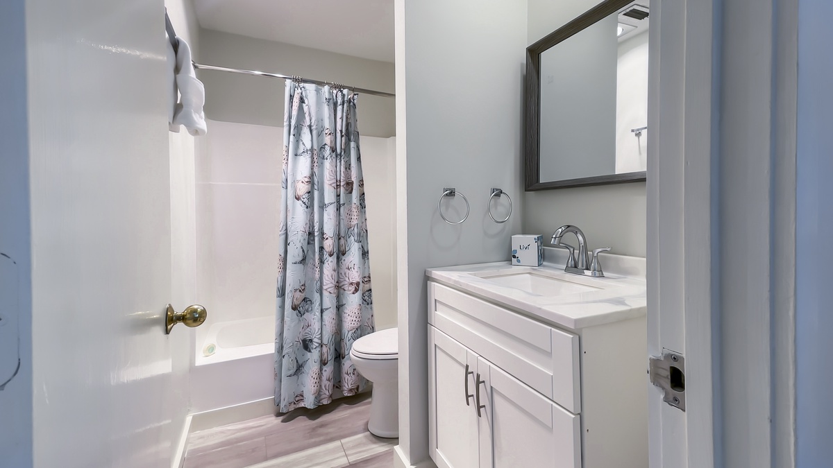 The blissfully comfortable guest rooms can be found on the second floor. In one, a pair of twin beds enjoy an inspired beach motif. In the other, a spacious king-size bed anchors a space with flat-screen TV and tall windows. They share access to a roomy full bath with tub and shower.