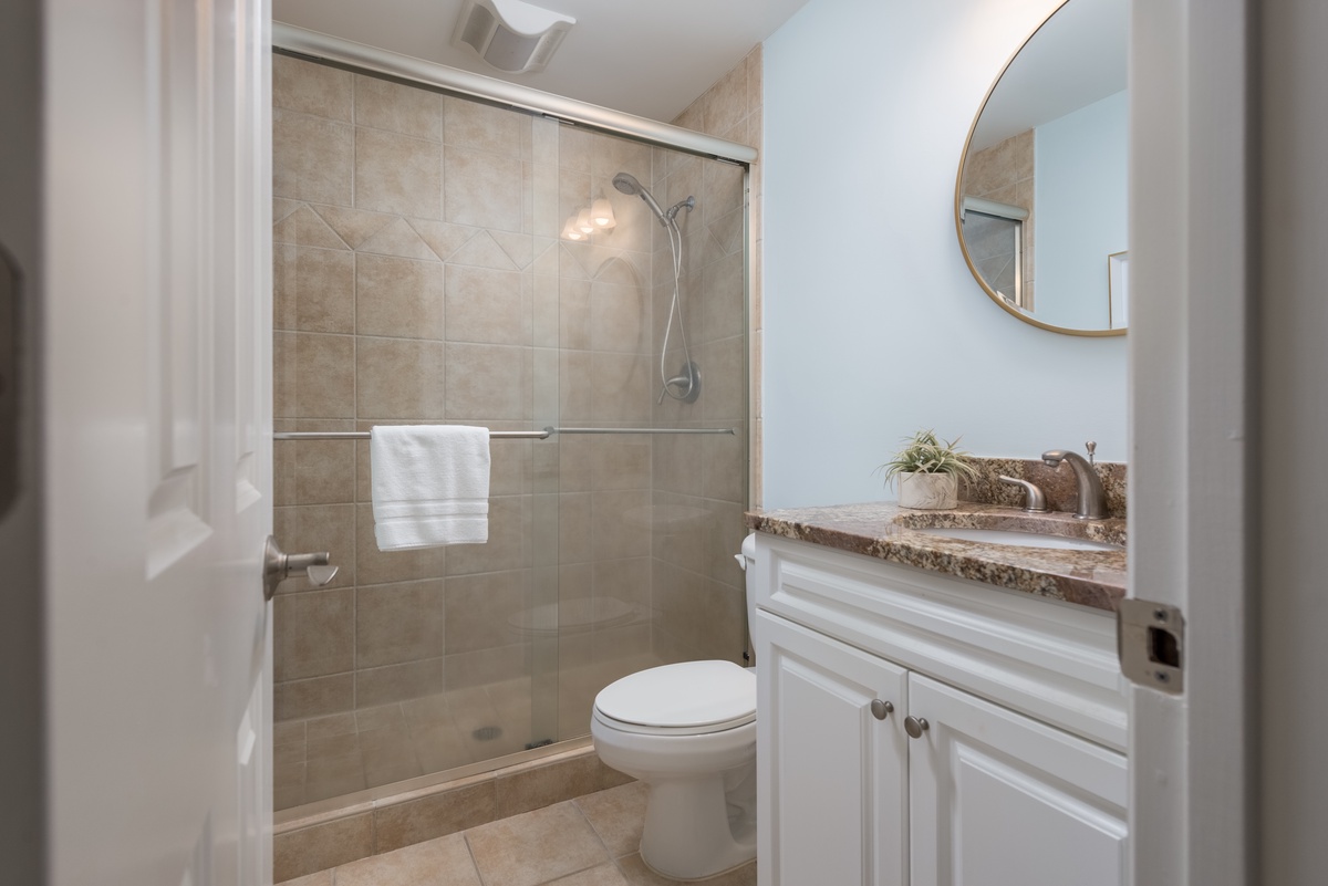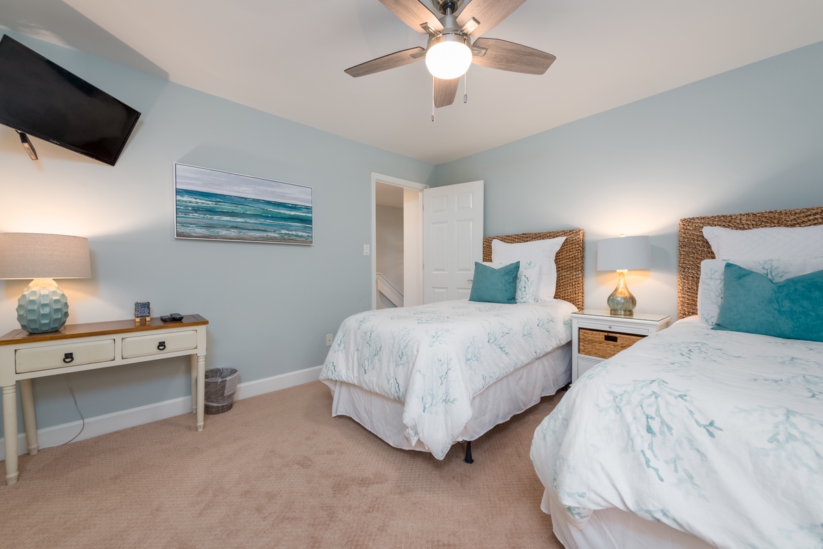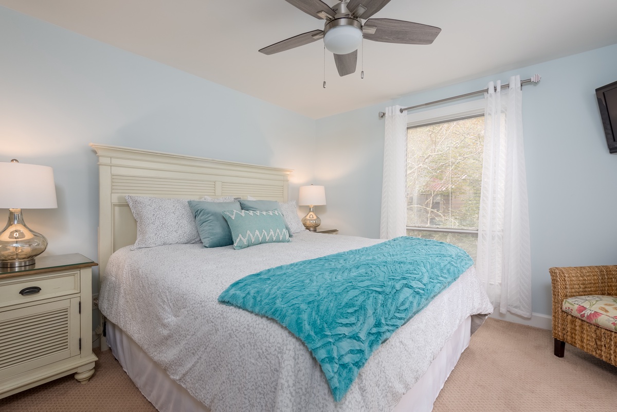 All three bedrooms are located on the second level. The master bedroom with a king is also decorated in Carolina blue and white, offers a flat screen TV, and has a private bath with granite counters and a tiled walk in shower.