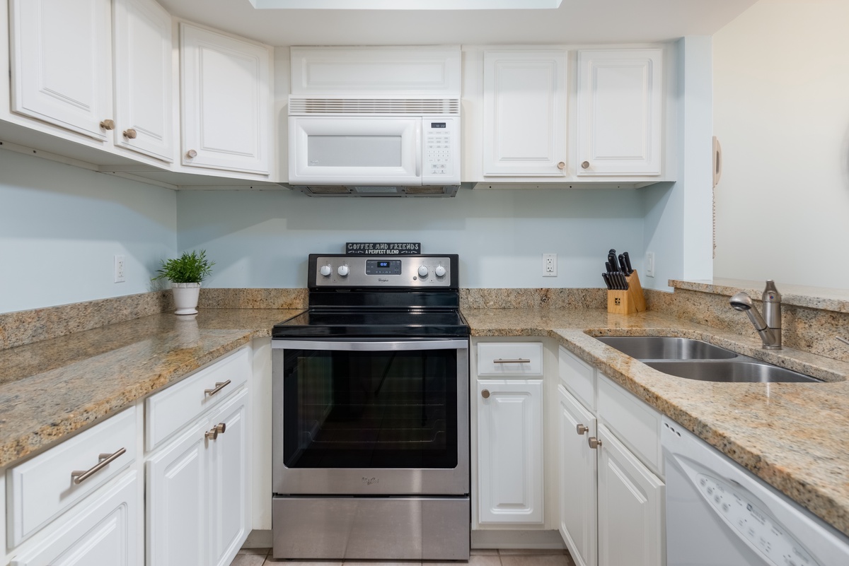 The dining area, also with a courtyard view, is furnished with a table and six chairs and is adjacent to the renovated kitchen complete with stainless steel appliances and granite counter tops. For convenience, there is a laundry closet and a half bath off the entry hall.