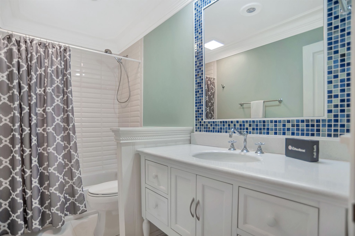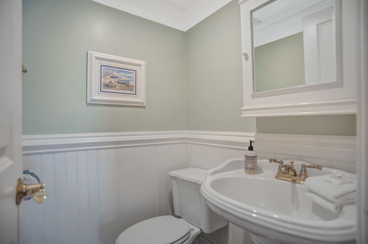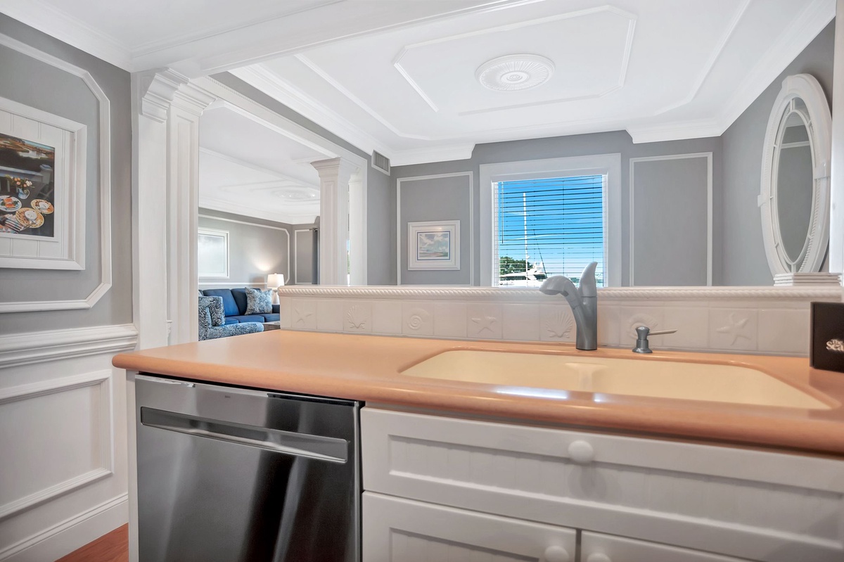 Hardwood floors and custom trim work running throughout speak to the craftsmanship found throughout the villa, even in smaller spaces like the half bath and full laundry found just off the entrance. On walls and ceilings, this customized trim lends grandeur to a great room which sees a sofa and loveseat facing a flat-screen TV with postcard-perfect framed by a set of sliders.