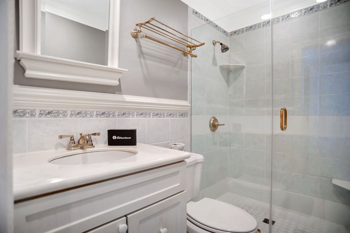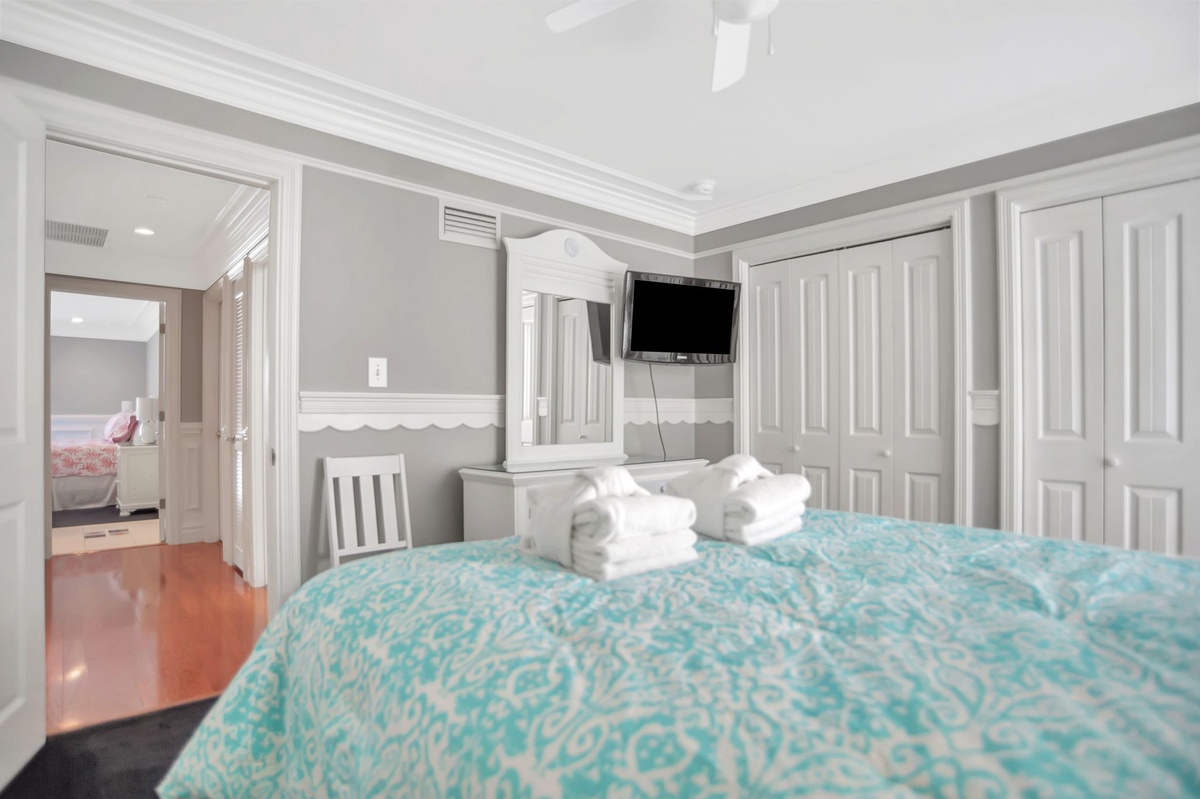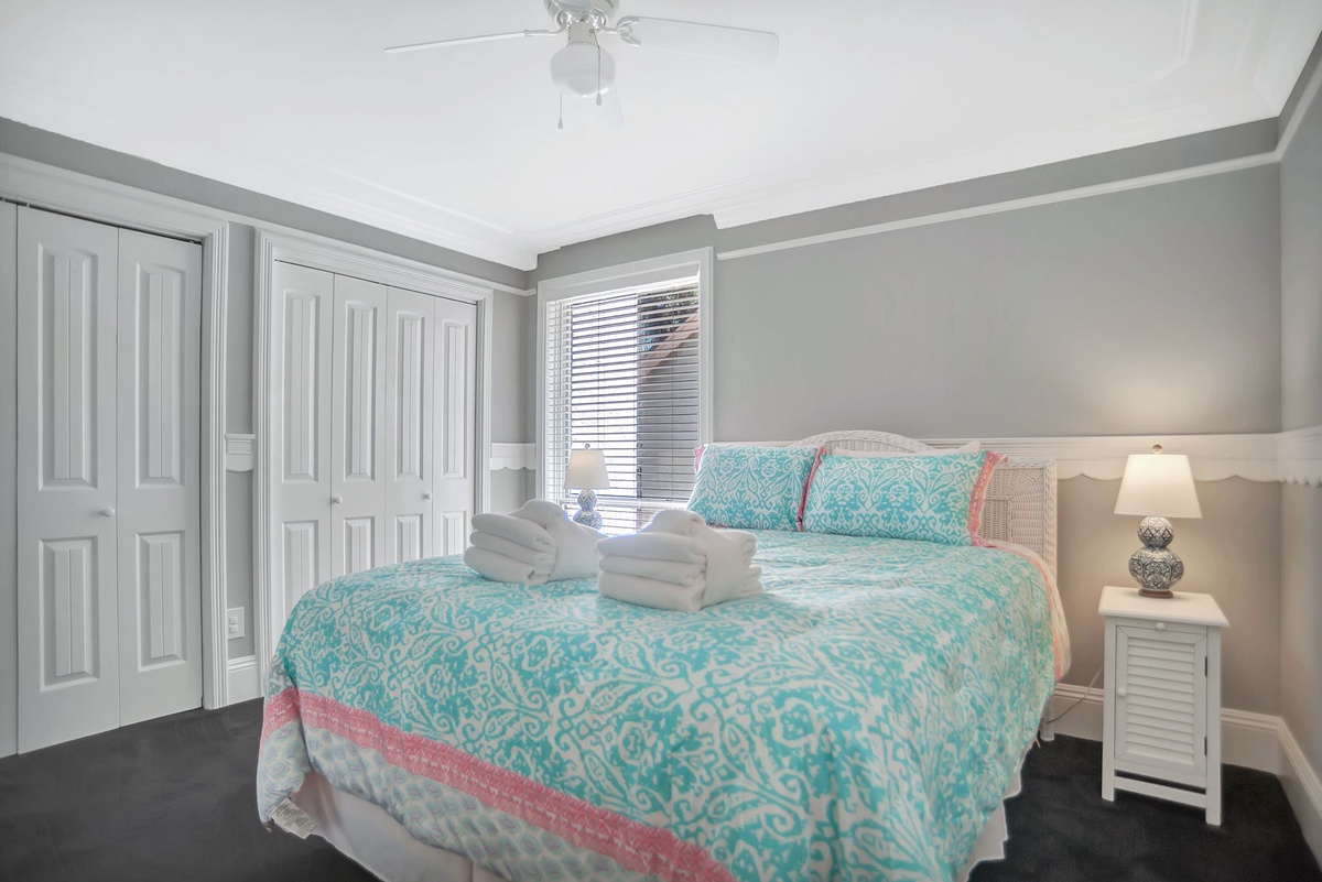 Two guest rooms can be found atop a staircase that dazzles with custom millwork. In one guest room, a queen-size bed anchors a space with ceiling fan, flat-screen TV and access to a full bath with tub and shower. The other serves as a primary suite, with king-size bed, ceiling fan, flat-screen TV, views directly out to the lighthouse and ensuite bath with dual basin vanity and walk-in shower.