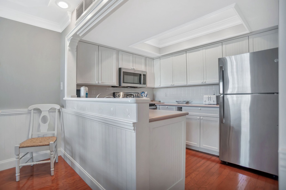Step through them, and you’re enjoying outdoor dining on a private patio set right at the edge of the harbour, with the lighthouse towering above. A nearby dining room seats eight beside the fully stocked kitchen, with tall ceilings, stainless steel appliances and wraparound counters.