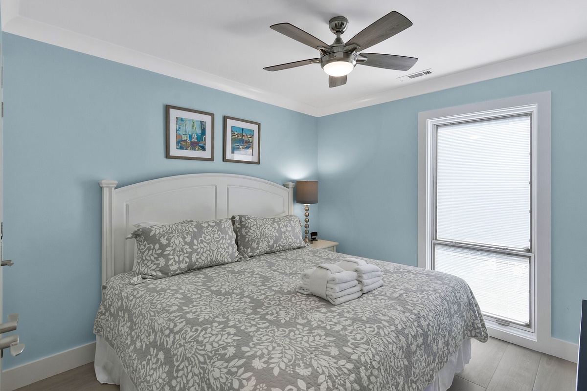This magnificent vacation villa also offers tranquility and comfort in two bedrooms. The first sees a plush swing king bed anchoring a space with built-in dressers and a wall-mounted flat-screen TV. This room has access to a hallway bath with extra-wide single basin vanity and spacious walk-in shower with small step up.