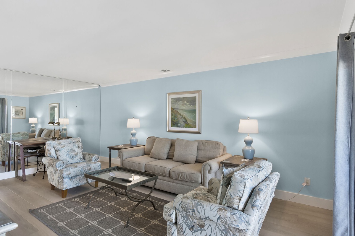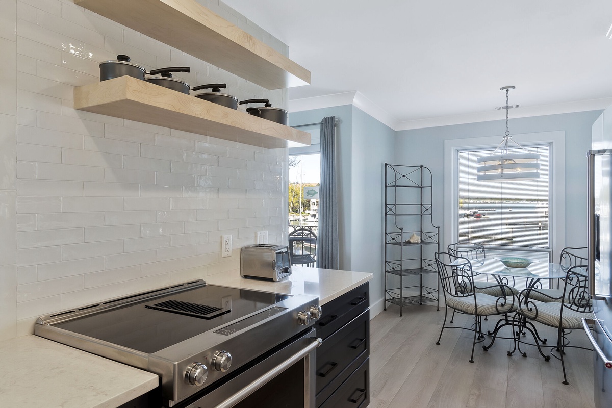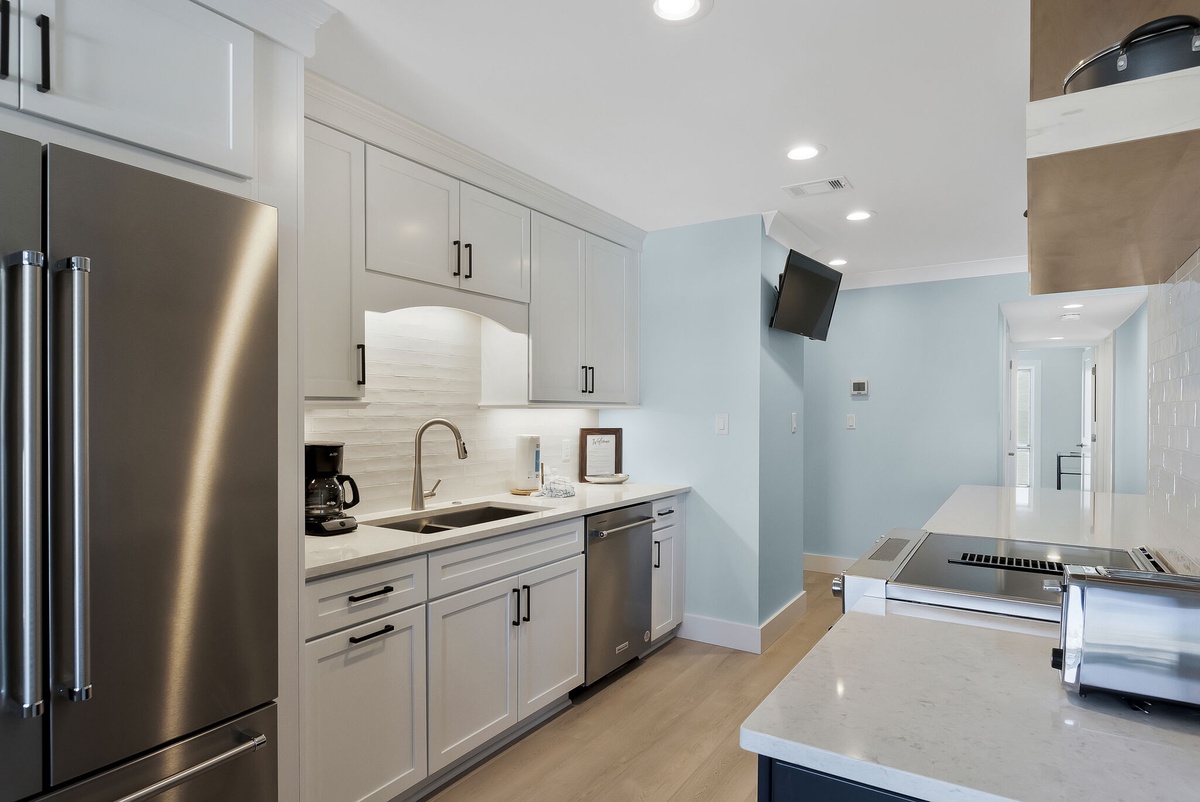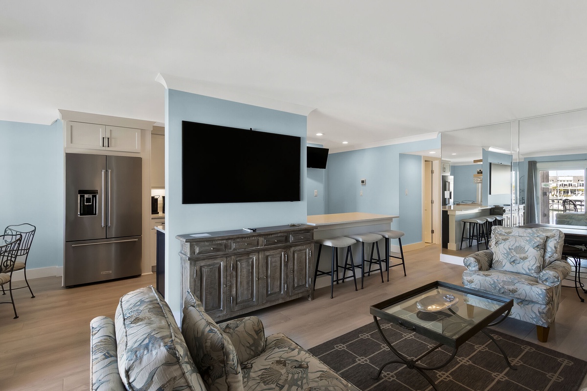 Framing that postcard-perfect view of the lighthouse are tall windows that bathe the main living space in sunlight. Set to enjoy both the scenery and a massive flat-screen TV is a plush sofa and 2 armchairs that anchor the great room. The sightlines from this space draw the eye naturally to the candy-striped lighthouse, seen just beyond the charming, elevated patio kissed by sea breezes. Ingeniously open to the main living space, the kitchen delights with modern design, upgraded finishes, and updated appliances. A wide counter with bar seating for three transitions to a flat cooktop stove, set across the galley from the stainless-steel French door refrigerator, coffee station and dishwasher for a gourmet powerhouse of beauty and function.
