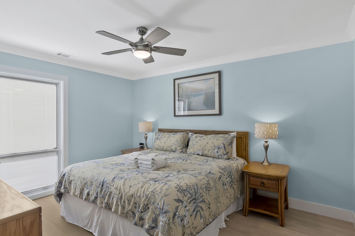 The primary suite comforts with a soothing floral motif and a king bed. In addition to a flat-screen TV and tall windows, this suite also has access to a private bath, offering a single basin vanity in marbled granite and a tub/glass enclosed combo.