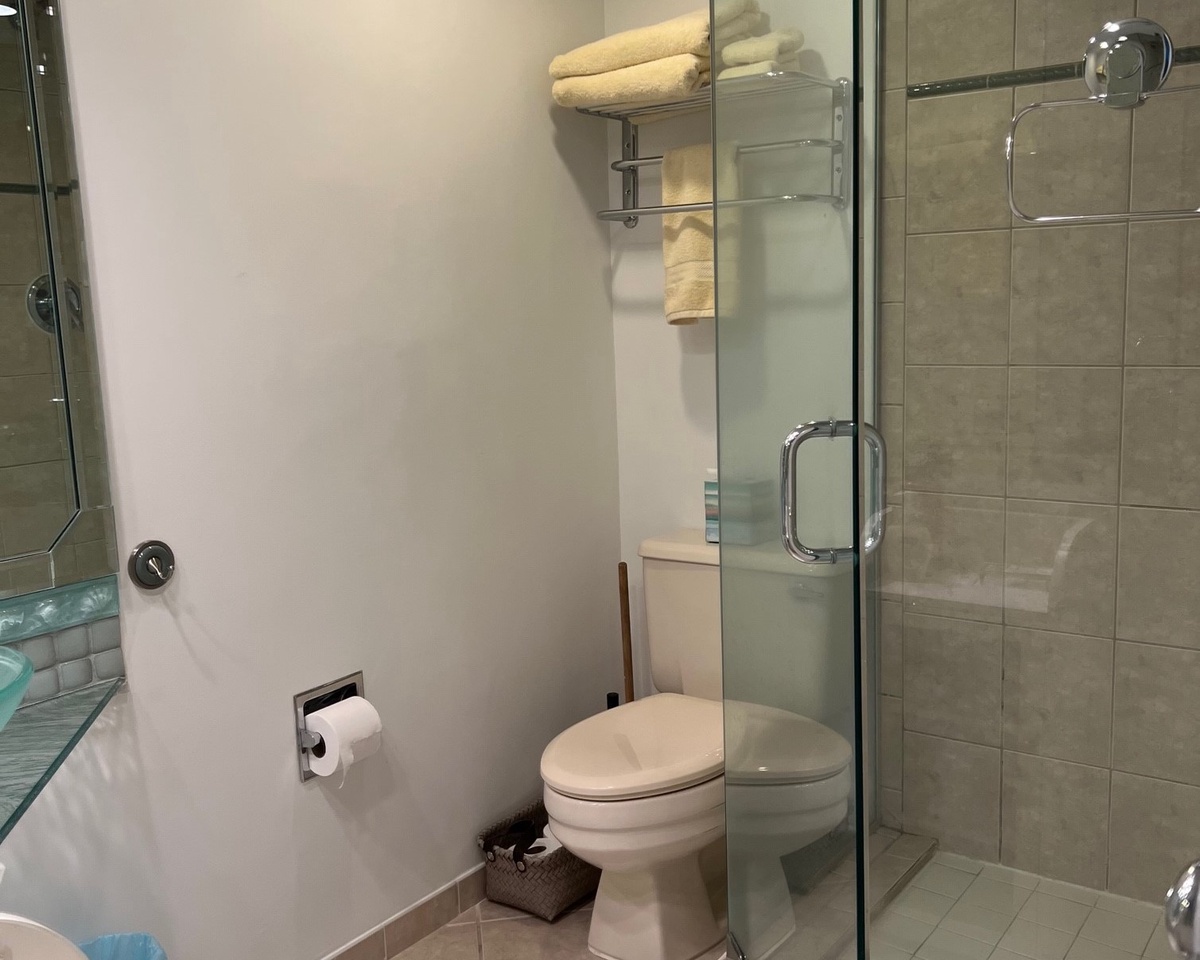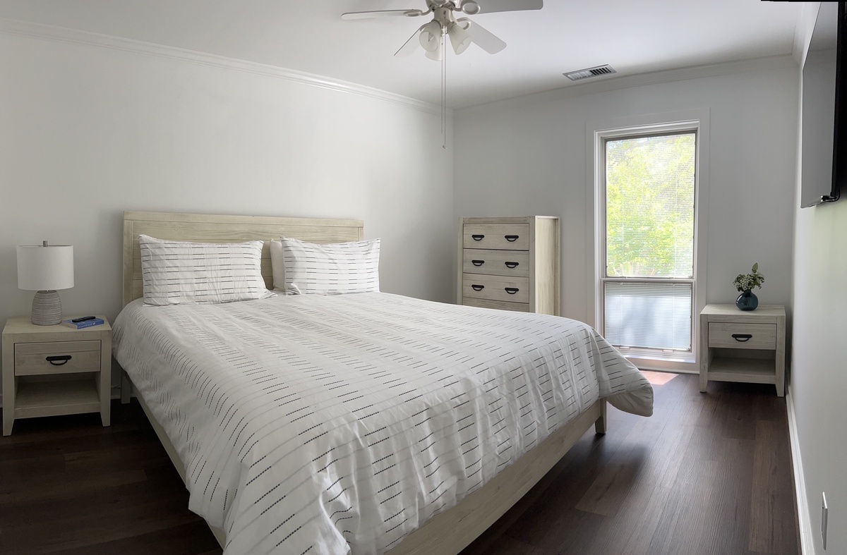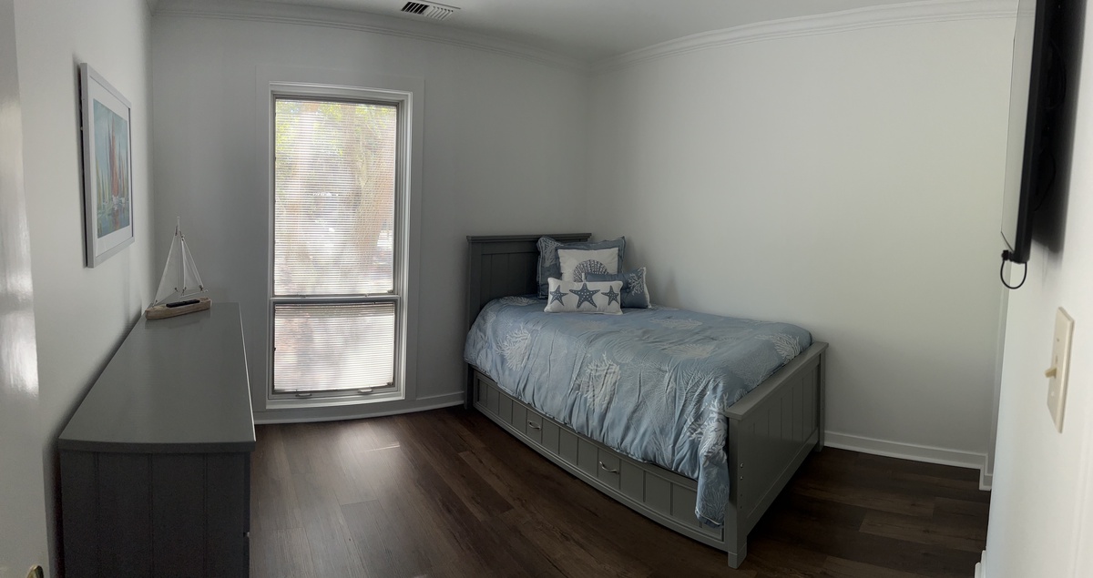 Blissfully comfortable, the three guest rooms each offer tranquility and relaxation. In one, a king-size bed invites you to unwind amid tall windows, with a ceiling fan and flat-screen TV rounding out the amenities. In the other, a twin bed with twin trundle rests before a flat-screen TV with tall windows soaking in the scenery. Both guest rooms enjoy access to a private bath with spacious walk-in shower.