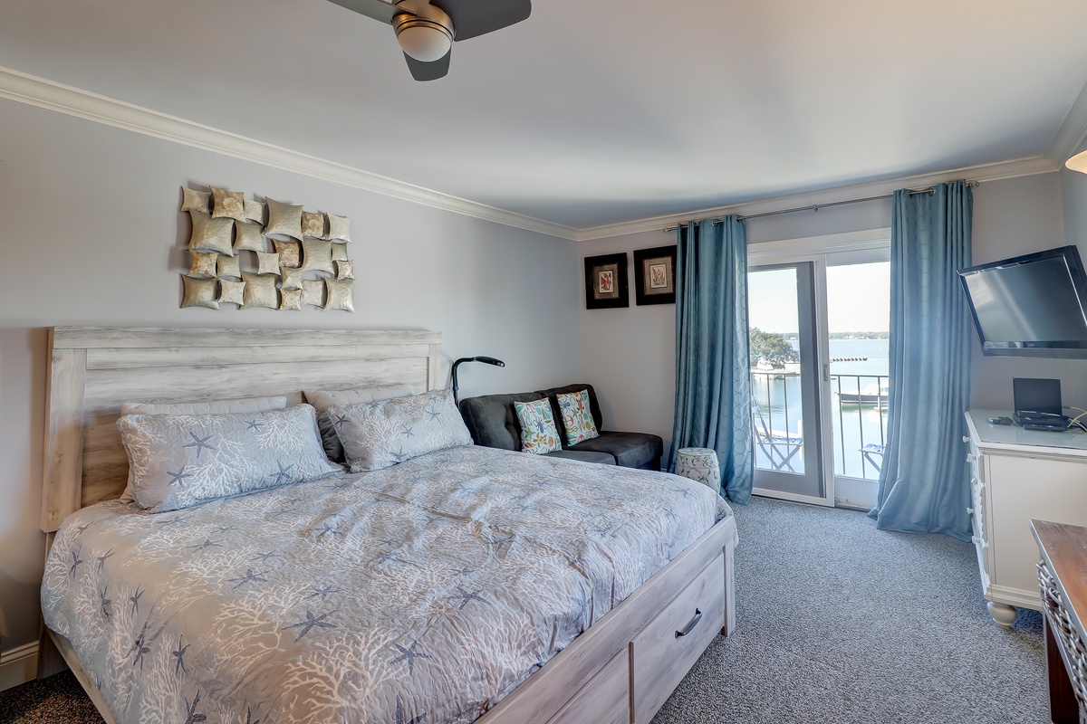 The ultimate expression of this artistic update can be found in the bedroom, where a lush king-size bed faces a wall-mounted flat-screen TV surrounded by coastal inspired furnishings that exude seaside charm. It all frames a view of a picturesque outdoor deck, accessible through sliders, that looks down on the world-famous Harbour Town Yacht Basin and across to the iconic lighthouse.