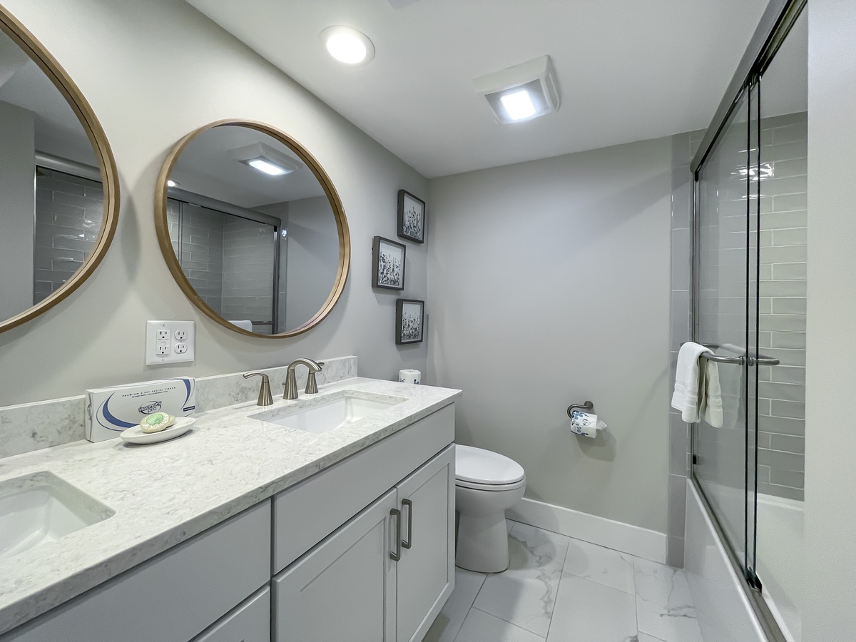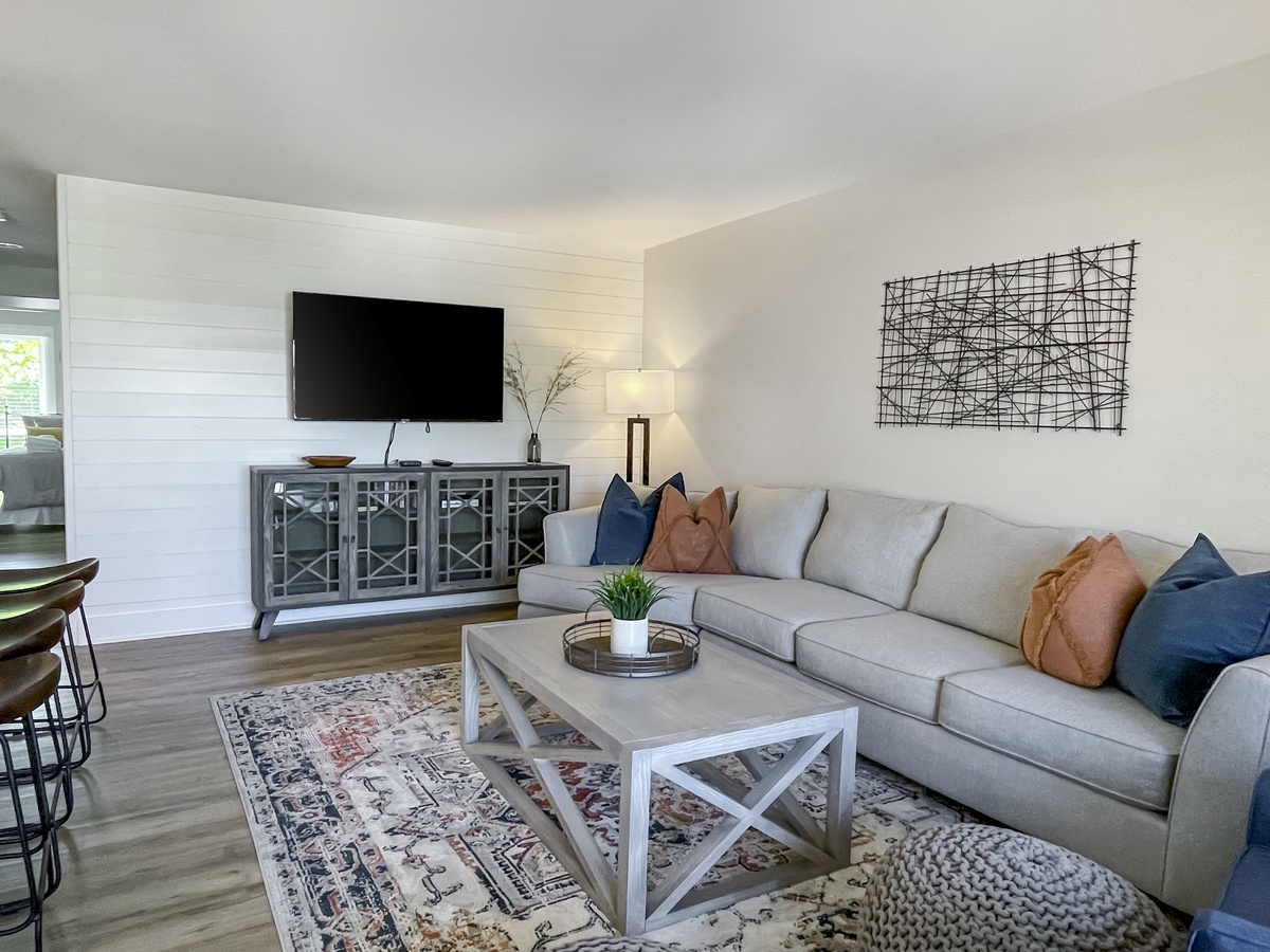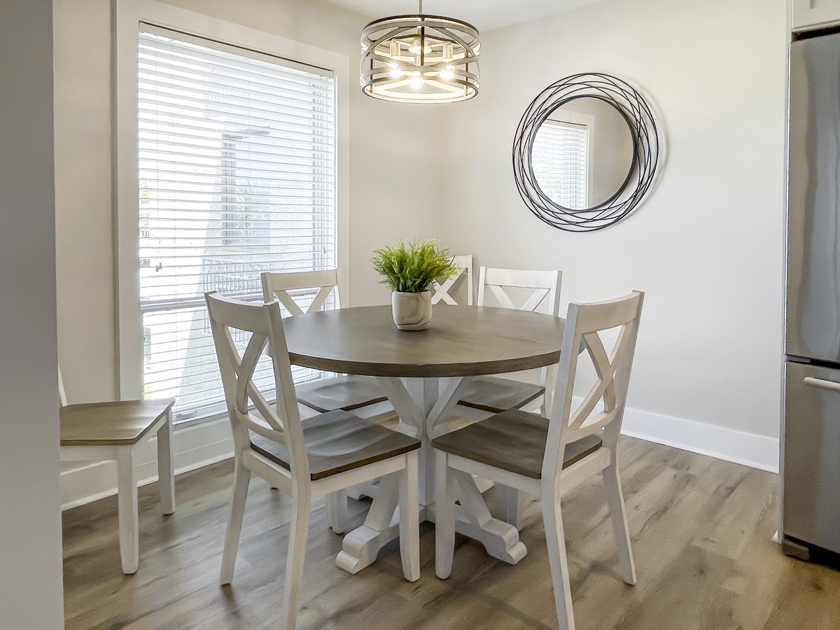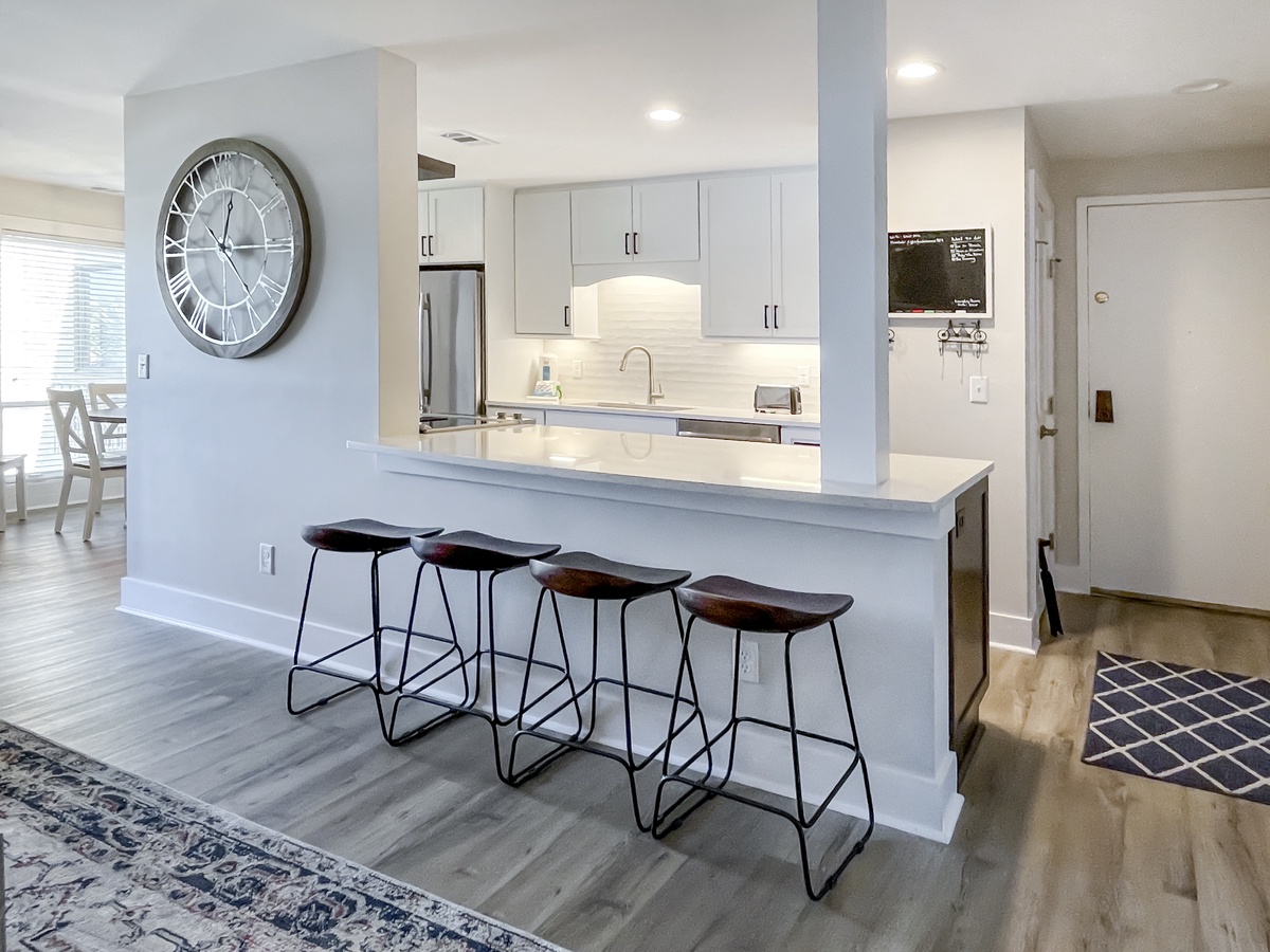 Recent renovations have opened the living spaces up, letting those postcard-perfect marina views fill the whole space. To one side, the living room sees a sectional sofa and two armchairs facing a flat-screen TV mounted on an accent wall of shiplap. To the other, the exquisite kitchen offers state-of-the-art appliances amid luxurious finishes. Dining for four nearby captures mesmerizing views of the Harbour Town lighthouse, but the scenery is best enjoyed from the elevated deck just beyond a set of sliding glass doors.