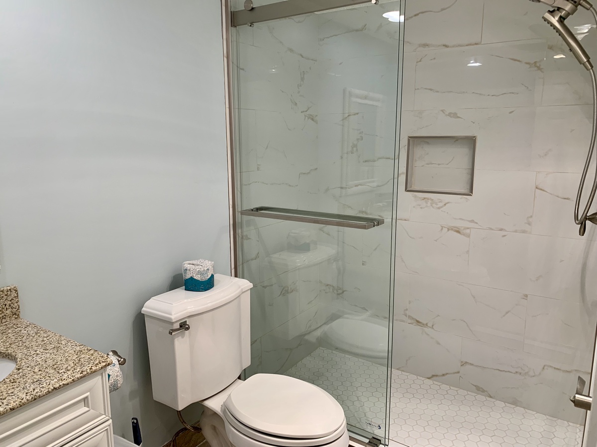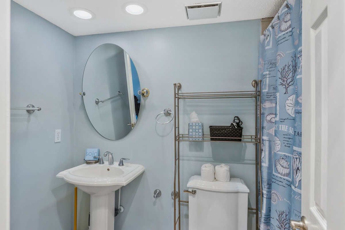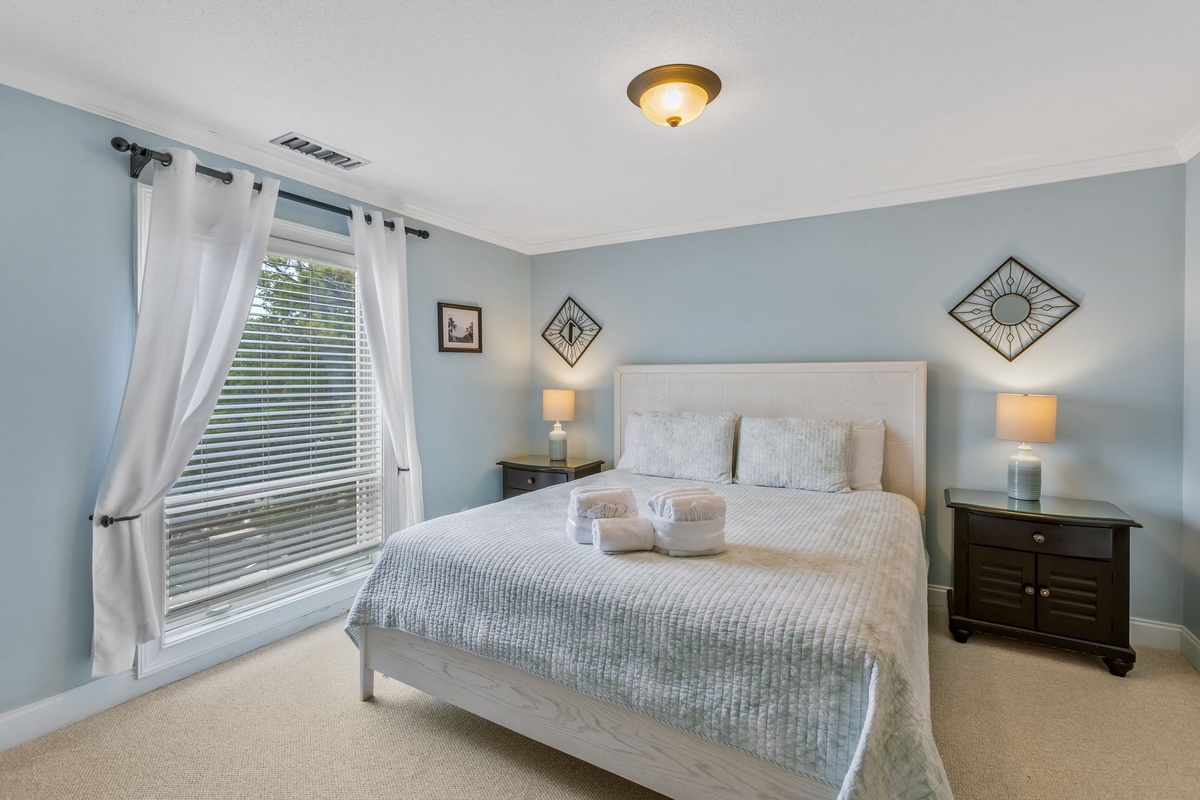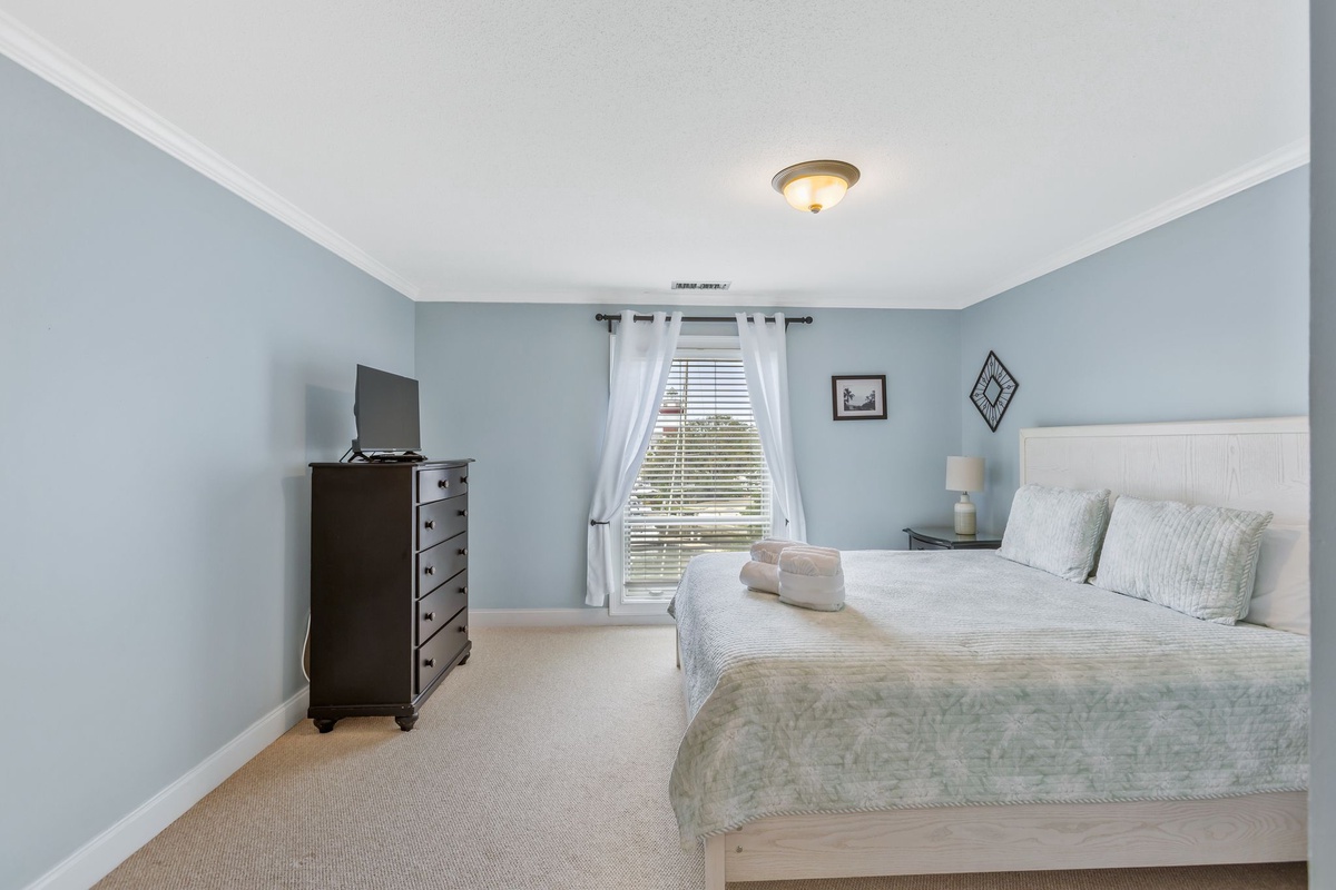 Viewing all of Harbour Town, the bedroom is elegant with white and black wood furnishings and soothing hues of blue and cream on the king-sized bed, plus a flat screen TV. With blue walls, the bathroom features stone flooring, a pedestal sink and a tub/shower combination.
