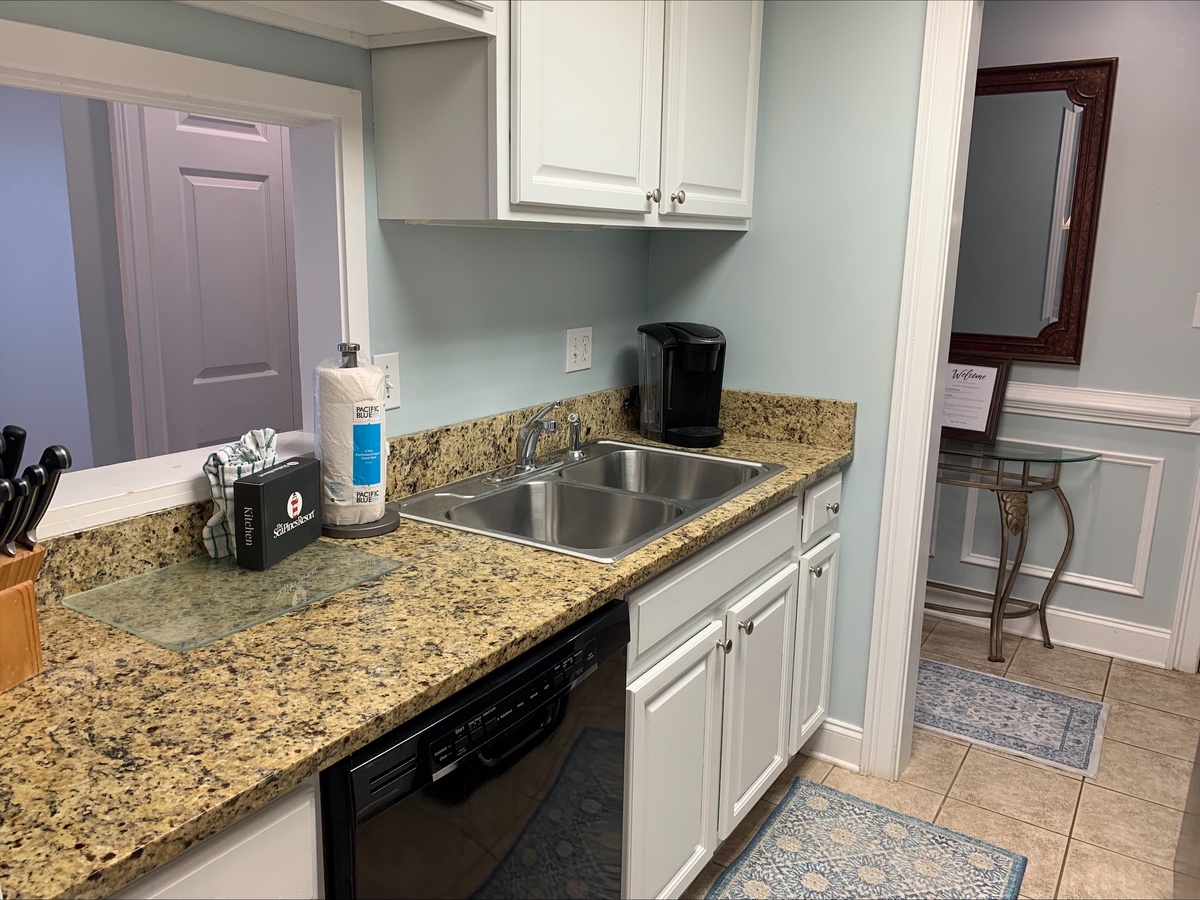 Adjacent to the dining room, the kitchen is fully appointed and includes lovely tan and espresso granite countertops, with a pass-through window to the living room.