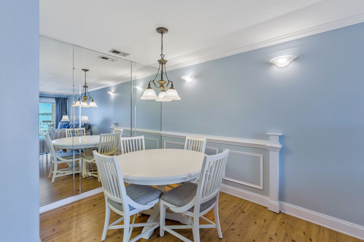 Backed by a mirrored wall, the dining area features comfortable seating for four at its white wooden table with a beautiful bronzed light fixture above.