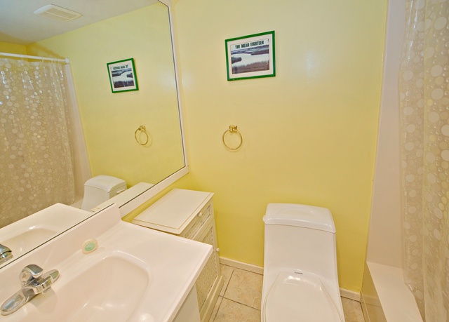 This villa also enjoys a full bath with single basin vanity, tub and shower, and striking tiled accent wall.