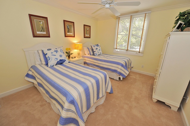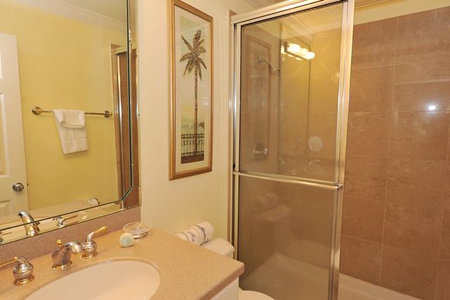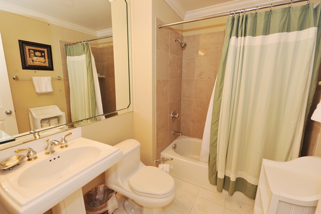 Also downstairs is a bedroom in celadon with 2 twin beds, cottage furnishings, a walk-in closet, and a TV and DVD. Neutrally toned, its bathroom has marble floors, a pedestal sink and stone surrounded tub/shower.