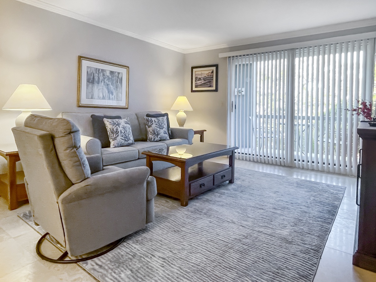 Magnificent travertine flooring guides you into an open living space dominated on one side by tall floor-to-ceiling sliding glass doors. They bathe the comfortable conversation area in natural light, making the coastal inspired blues and browns pop. Or, step through those doors and find yourself on a cozy patio with mosaic-topped patio table and seating for two.