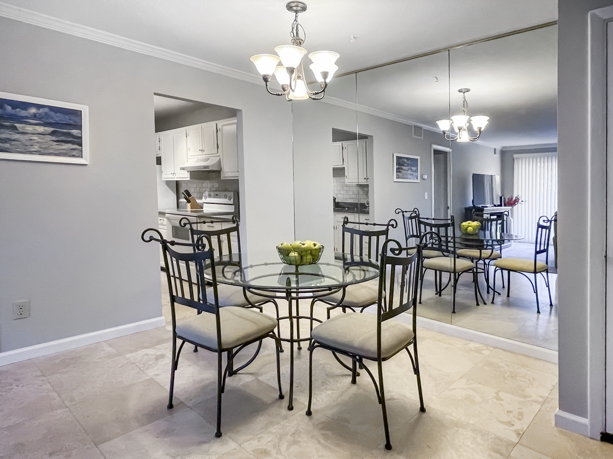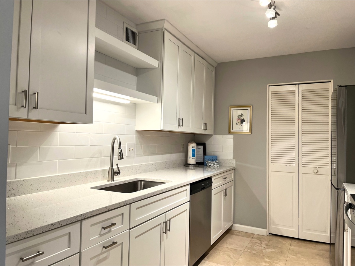 The newly updated interior dazzles with modern flair, while a sparkling mirrored accent wall in the dining room gives the entire space a sense of volume and elegance. Dining for four can be found around a stylishly modern beveled-glass top table, convenient to the wonderfully renovated galley kitchen. Here, brushed steel hardware and speckled granite in black and pearl highlight a newly transformed kitchen with all the amenities of home.
