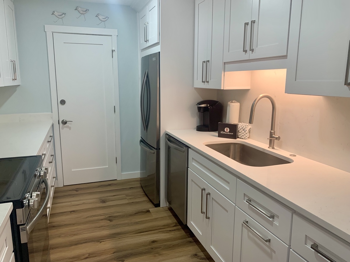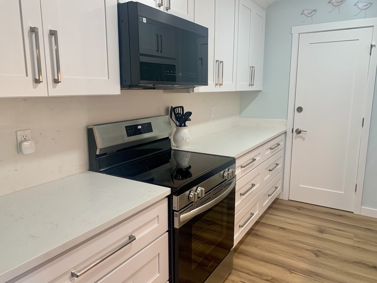 The kitchen blends style and function, featuring quartz countertops, modern appliances, and ample cabinetry stocked with all the essentials you need—whether you’re preparing a quick breakfast or a gourmet dinner.