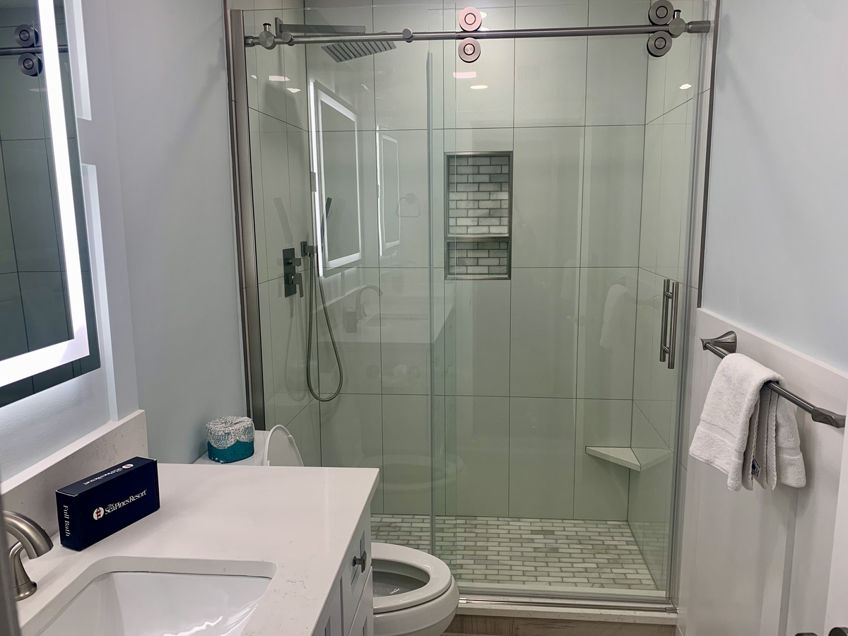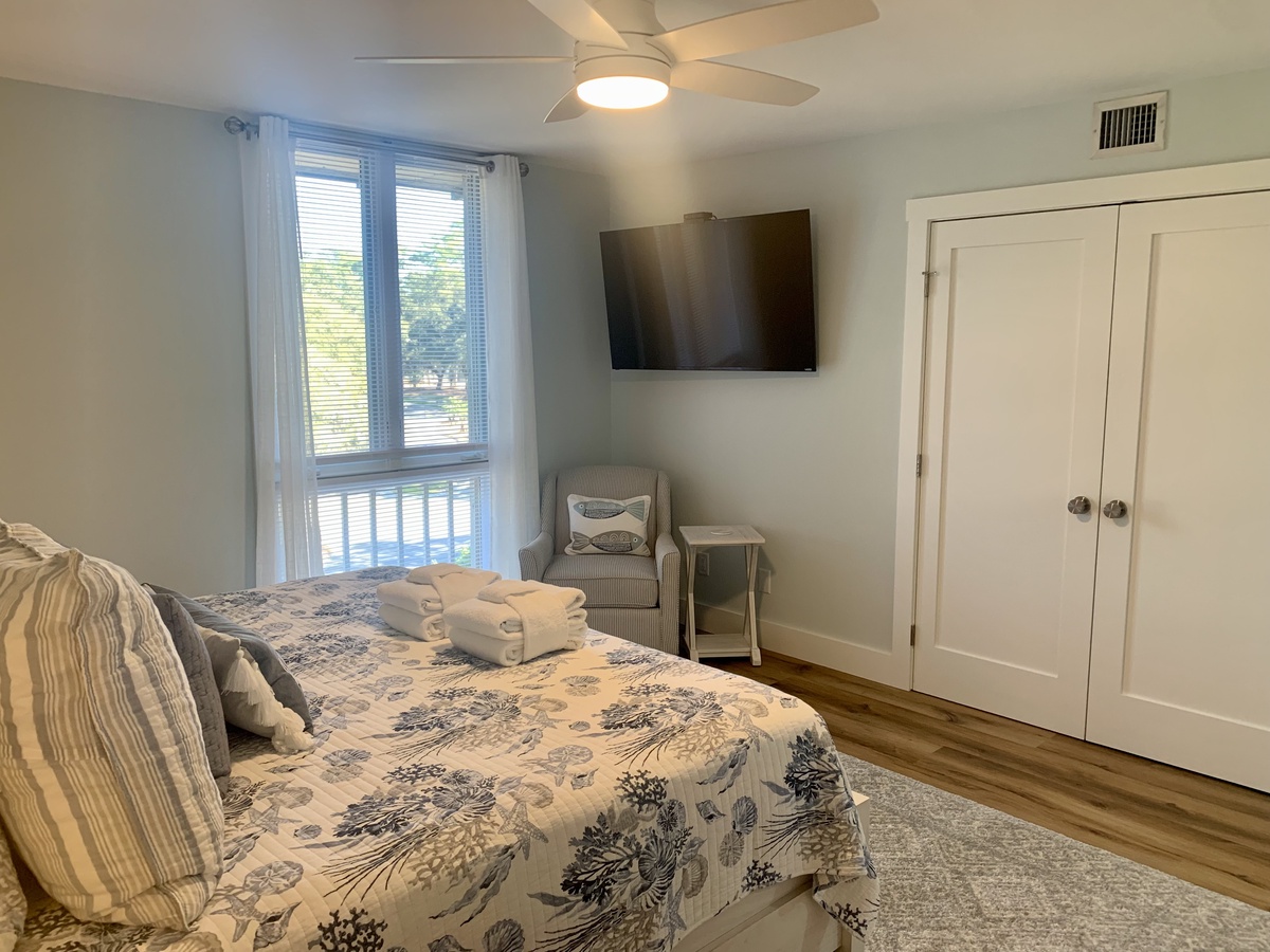 The bedroom is a true retreat, showcasing a beautiful bedroom set, a king-size bed for restful nights, and a flat-screen TV for added comfort. The fully renovated bathroom features a modern walk-in shower and spa-like finishes.