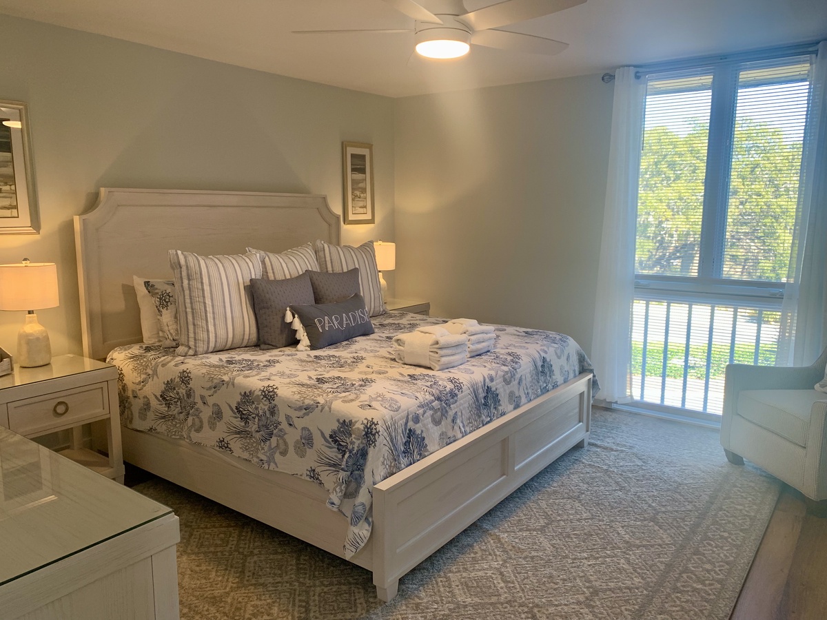The open-concept living and dining area is thoughtfully designed for comfort and connection. Relax in the spacious living room with plush seating (including a sleeper sofa), enjoy your favorite shows on the large flat-screen TV, or gather around the dining table for four. The electric fireplace creates a cozy atmosphere—perfect after a day on the beach or golf course. Step through the sliding glass doors onto the private balcony, an ideal spot to sip a cocktail, read a book, or simply unwind among the tranquil canopy views.