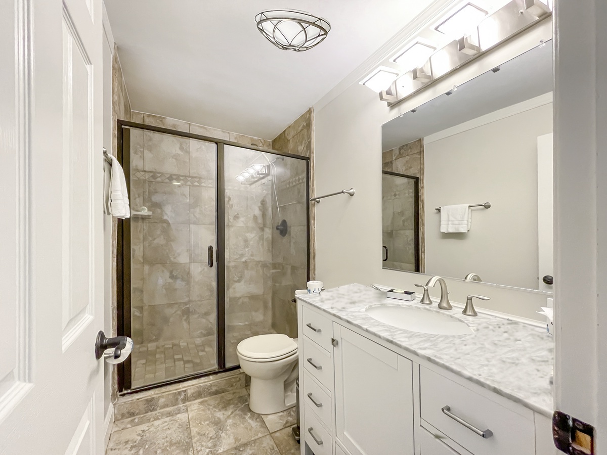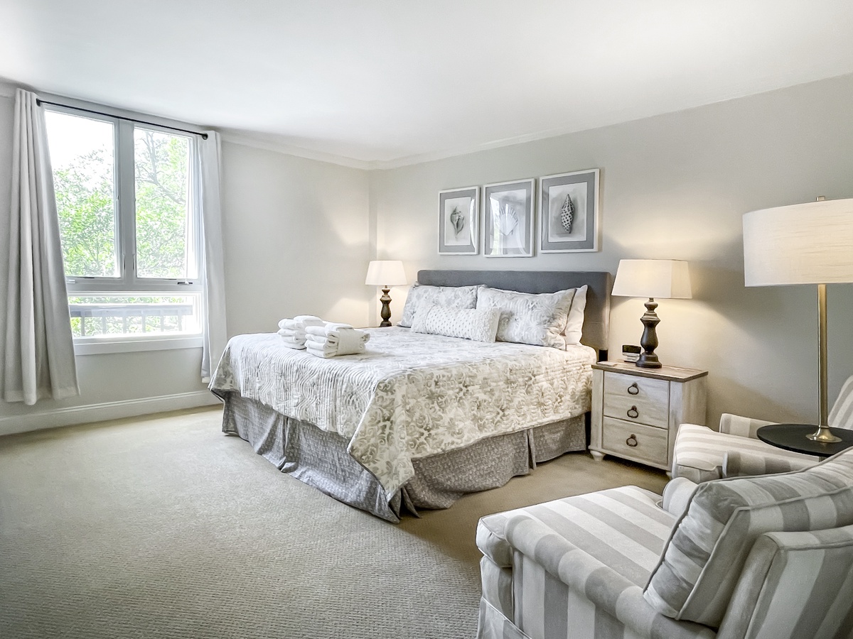 The lushly comfortable master bedroom offers a plush king-size bed with wide windows, flat-screen TV and private bath with spacious walk-in shower.