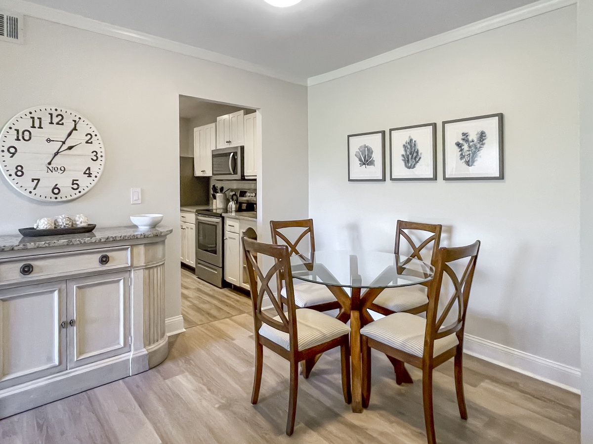 Adjacent to the dining area, the wonderfully updated kitchen adds style and flair to a functional galley space. Upgrades from speckled granite counters and new cabinets to a subway-tile backsplash lend a thoroughly modern look to a gourmet kitchen with full suite of stainless steel appliances.