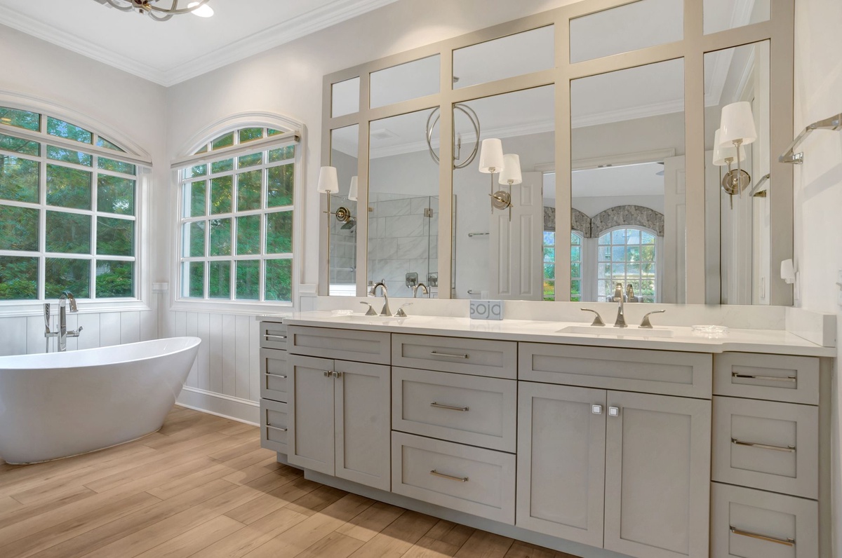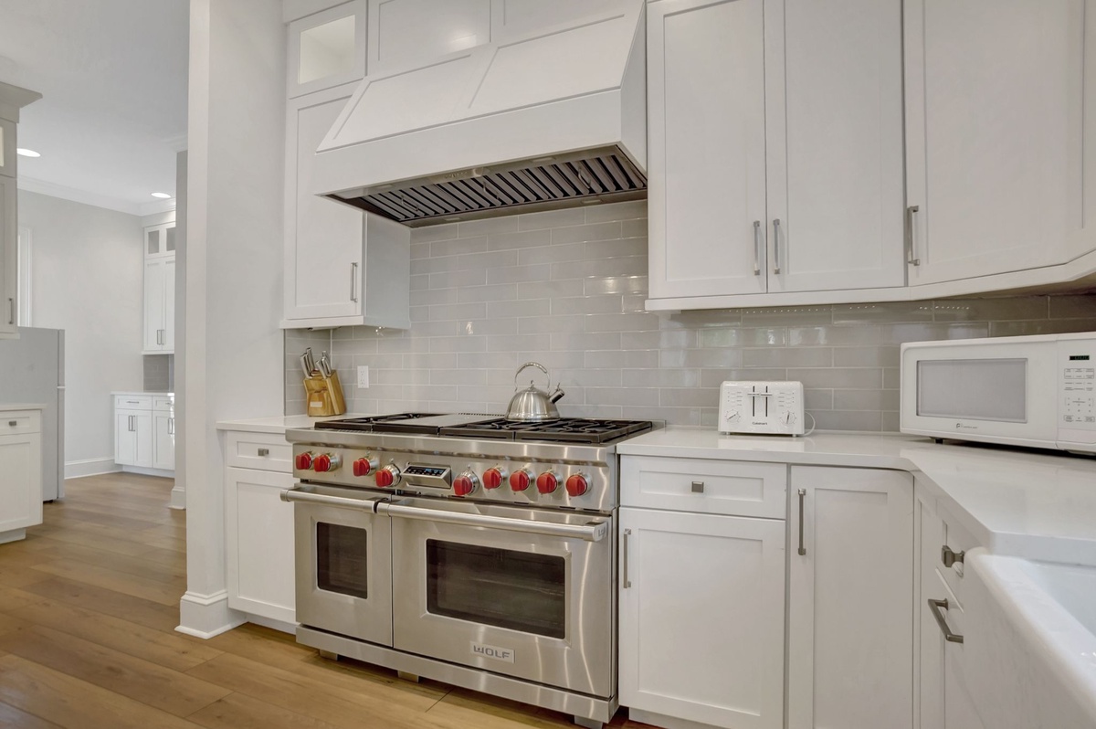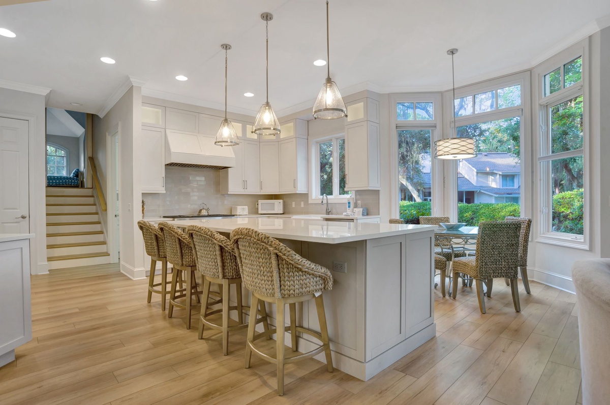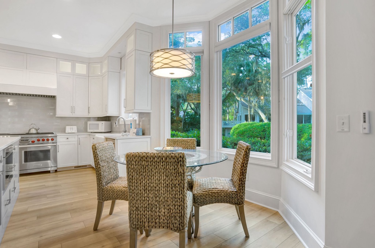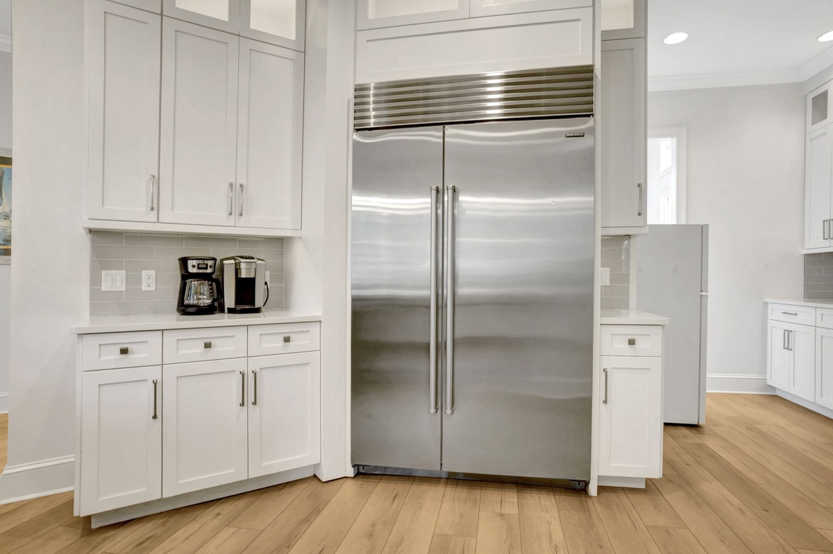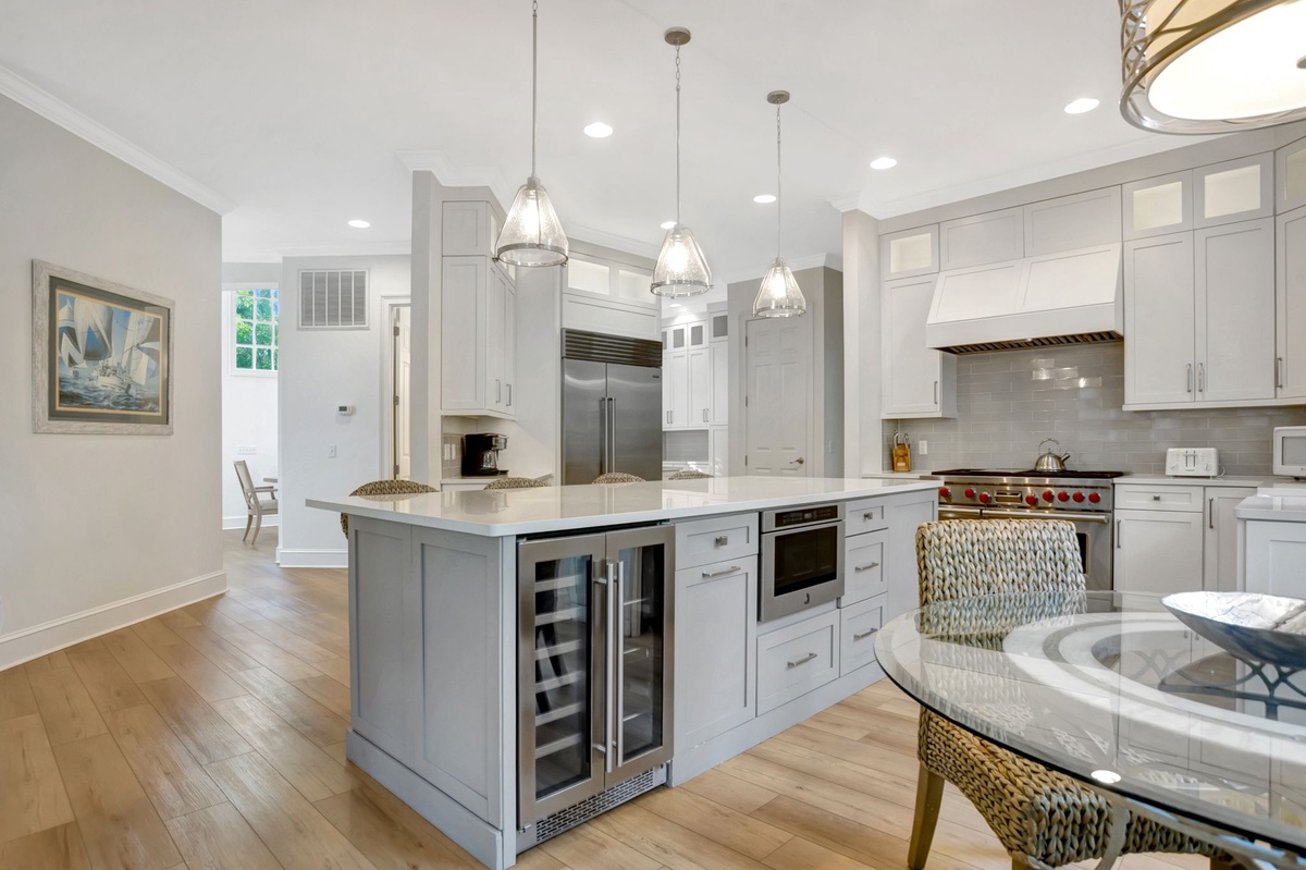 The kitchen is well-equipped with top-of-the-line Wolf/Subzero appliances. It has an eating area that seats 4, as well as 4 kitchen barstools. The dining room table comfortably seats 10 people with a butler’s pantry between the dining room and the kitchen. Off the kitchen is a laundry room with a sink and extra-large capacity washer and dryer.