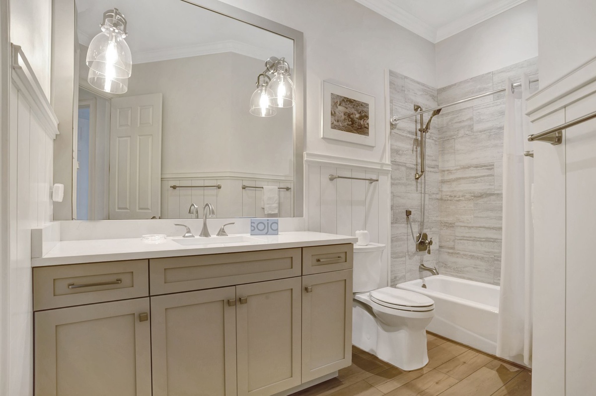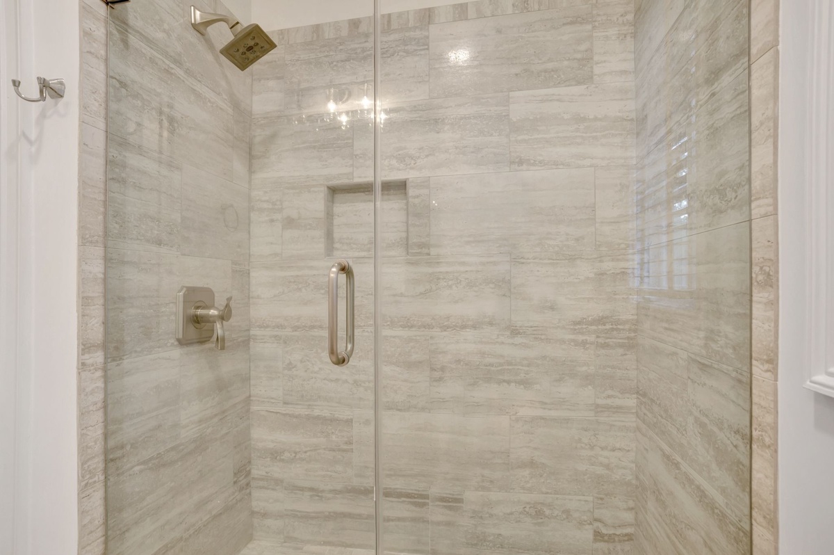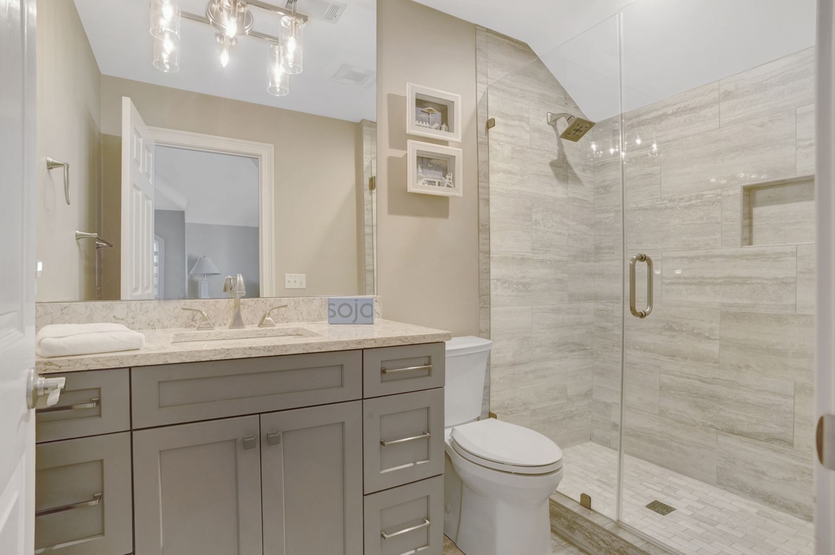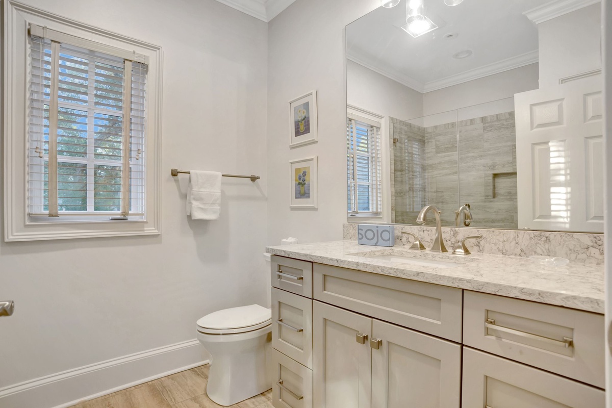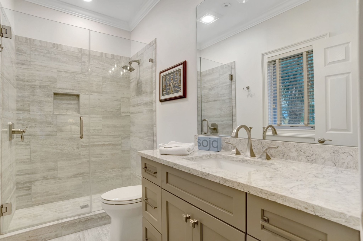 This beautiful, bright and cheery 6-bedroom, 6-1/2 bath home is located on the walkway, just 150 steps to the beach! Downstairs is a generous master suite with a king bed, as well as a pull-out twin. A second bedroom, also on the first floor has a queen bed. Upstairs are three bedrooms, all with queen beds, one of which has a private balcony overlooking the pool/spa area. A separate set of stairs off the kitchen leads to a large bonus room with 4 twin beds and 2 with trundle beds. All bedrooms have private baths.