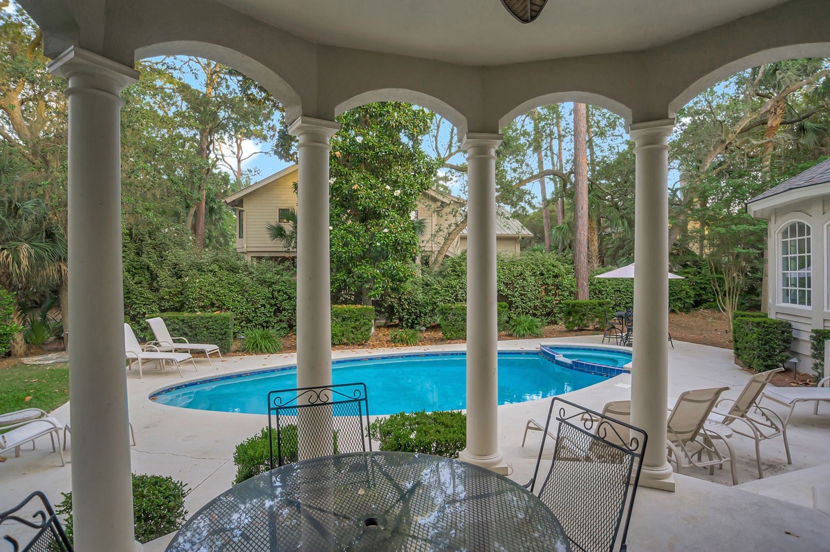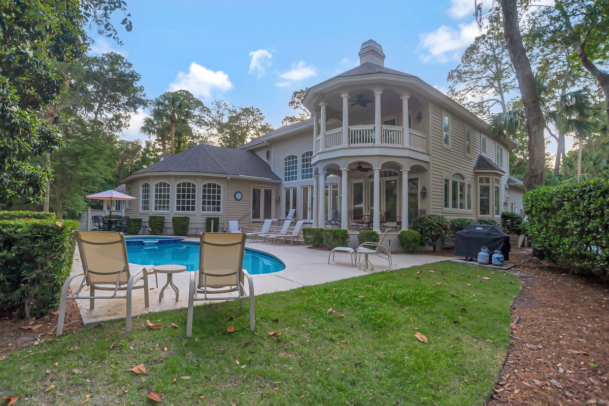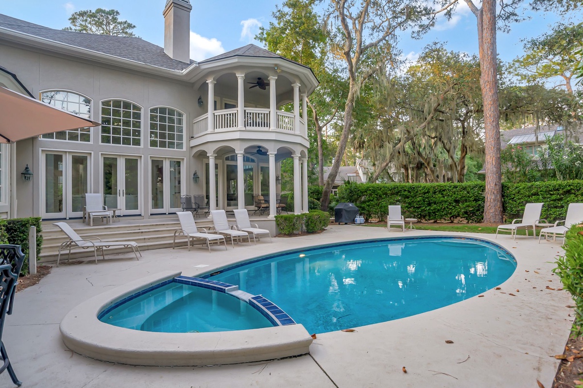Doors from the family room, living room, and master bedroom all lead out to a large, private pool and spa with generous seating and a large Weber propane grill.