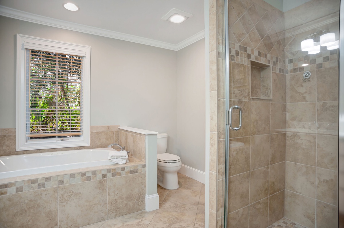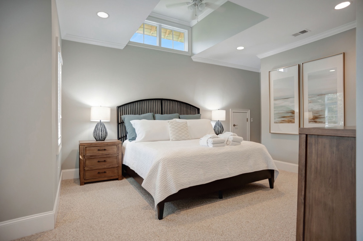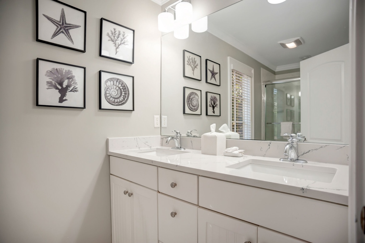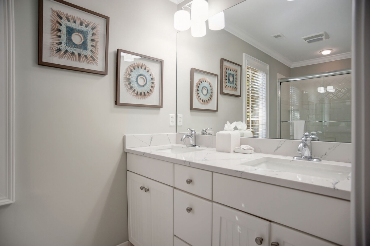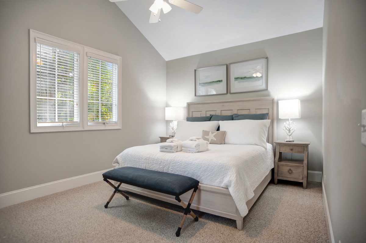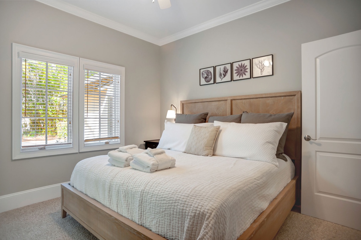 Continuing the calming neutral hues, the charming fifth bedroom holds one queen bed, plus a flat screen TV and walk-in closet. A private bath features a double granite vanity, bead board cabinetry and tub/shower combination.