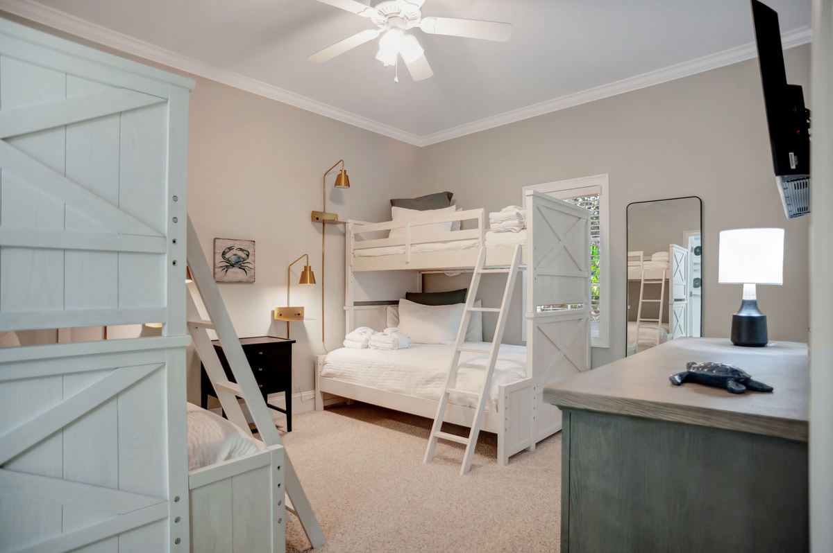 The third bedroom features two bunk beds (twin over double), a flat screen TV and walk-in closet. The bathroom has a tub/shower combination and double granite vanity.