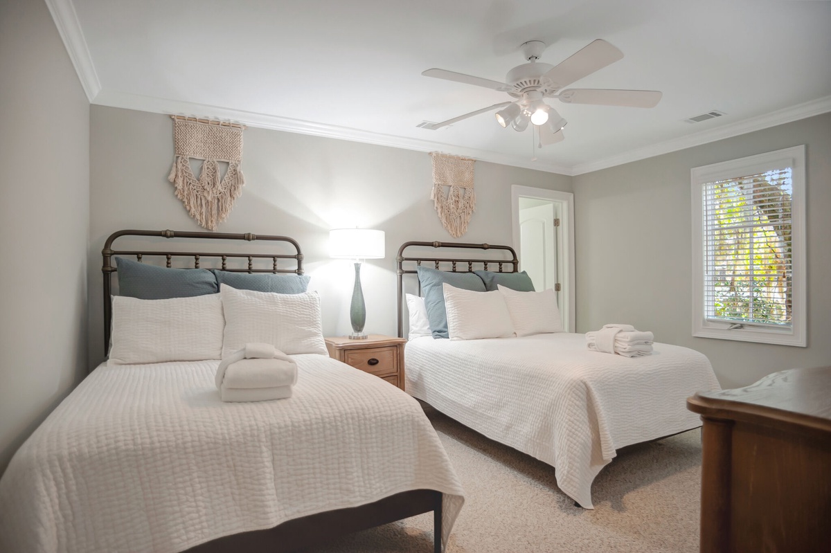 Upstairs are three more bedrooms, including a spacious and elegant second primary suite, offering a king-sized bed, and a large flat screen TV. If you need to work, there is a writing table with lots of light. This room boasts warm tones and high ceilings as well as a roomy walk-in closet. The primary bath comprises a whirlpool tub, double granite vanity and stone, dual-head shower.