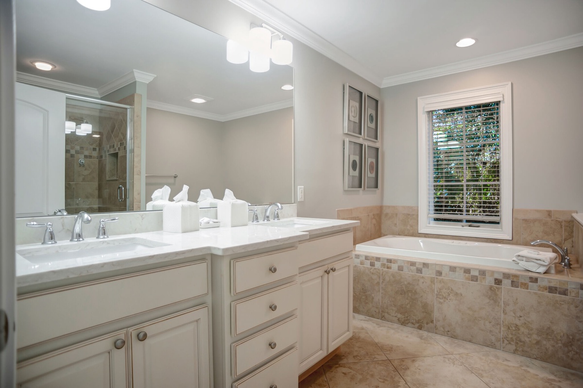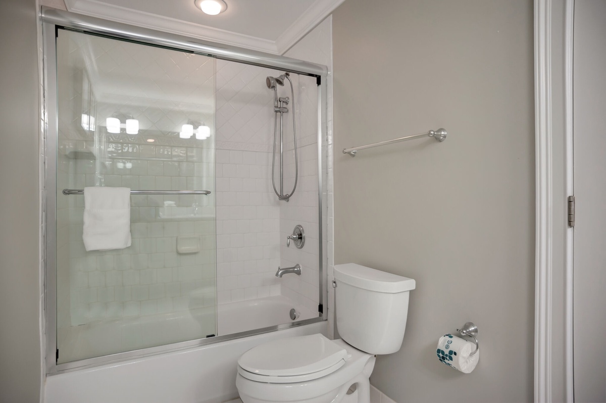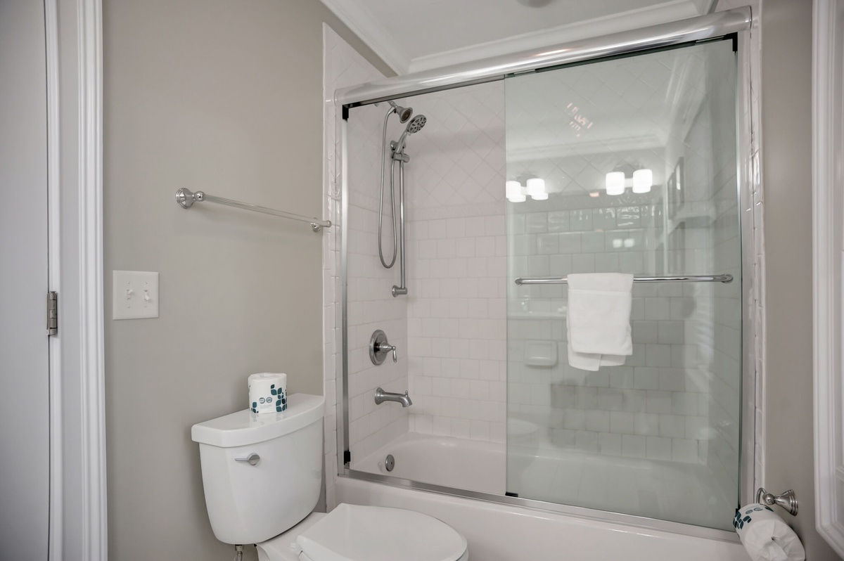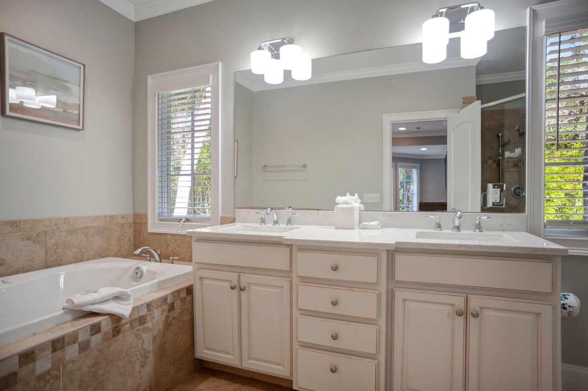 The second guest room holds a king-sized bed with flat screen TV and walk-in closet. Its private bath features a double granite vanity, bead board cabinetry and tub/shower combination.