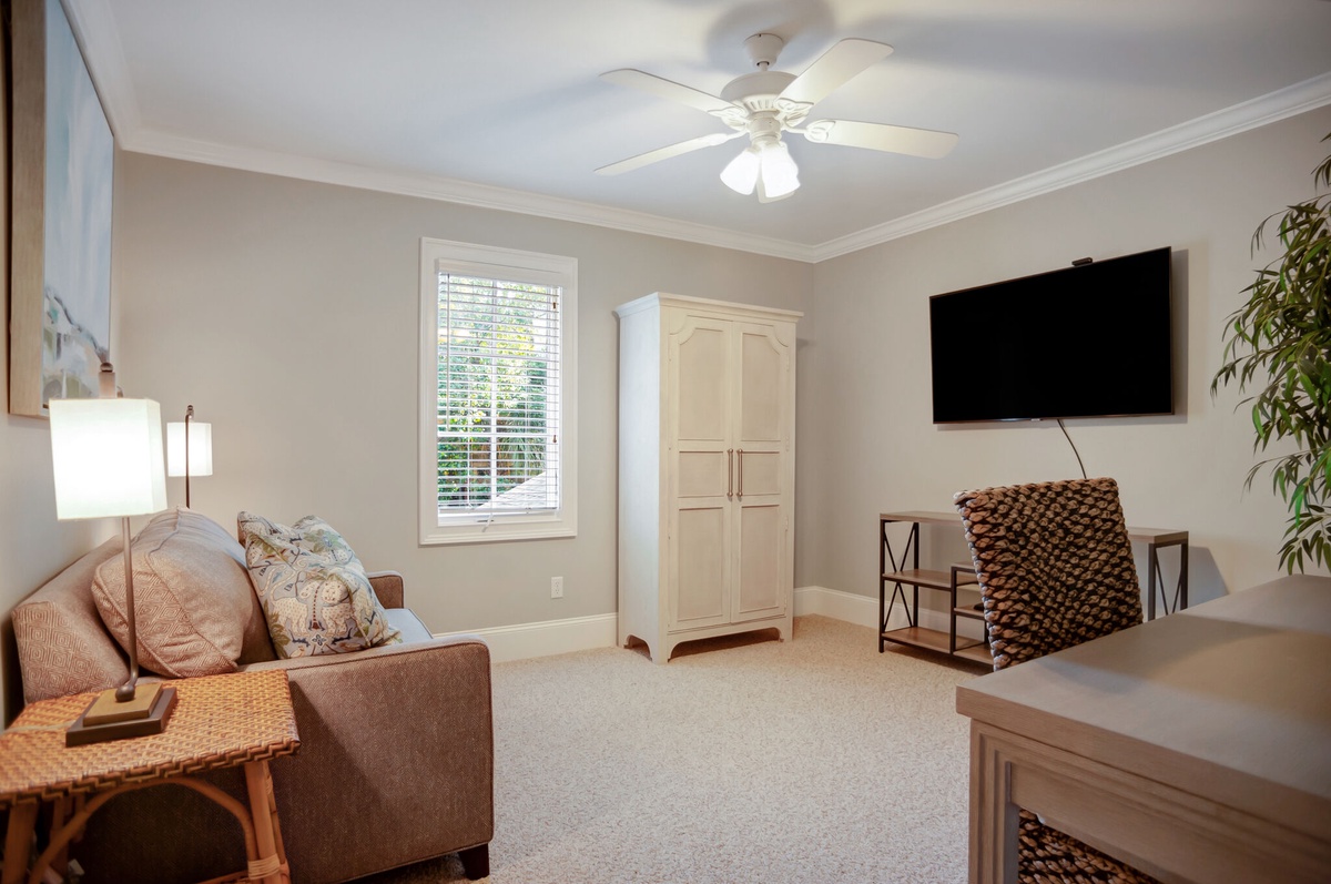 A cozy nearby den is the perfect spot for you to relax and watch your favorite programs on the large flat screen TV. This room can also double as a bedroom, as it offers a chair-and-a-half that converts to a twin bed. There’s an armoire for storage and a work station to power up your computer.