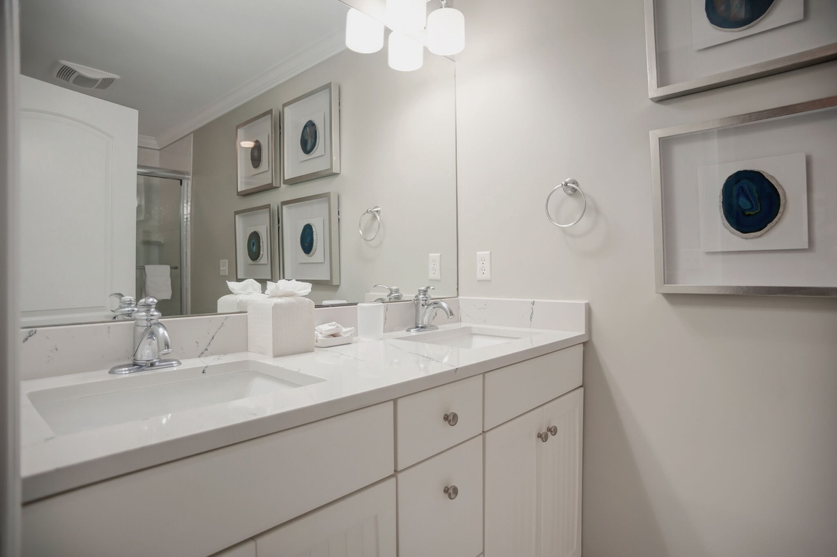 The relaxing theme continues to the sixth bedroom, which features two double-sized beds, a flat screen TV and a walk-in closet. This room boasts a spacious bathroom with a tub/shower combination and double granite vanity.