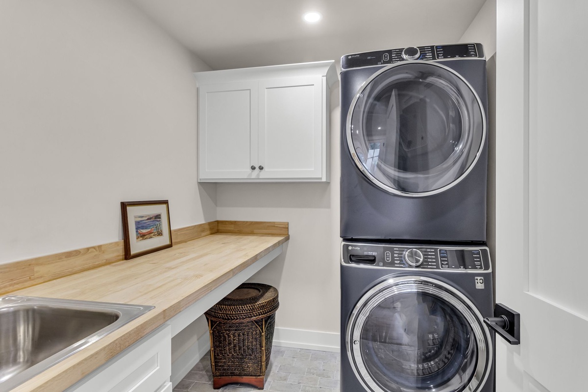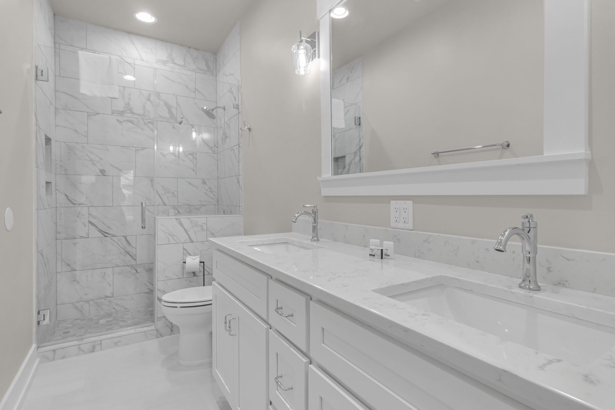 Along with a powder room and washer/dryer, this main floor also houses the first guest suite, a sprawling retreat with a king-size bed, flat-screen TV, ceiling fan, pool views and expansive en suite bath with dual-basin vanity and walk-in shower with dual showerheads.