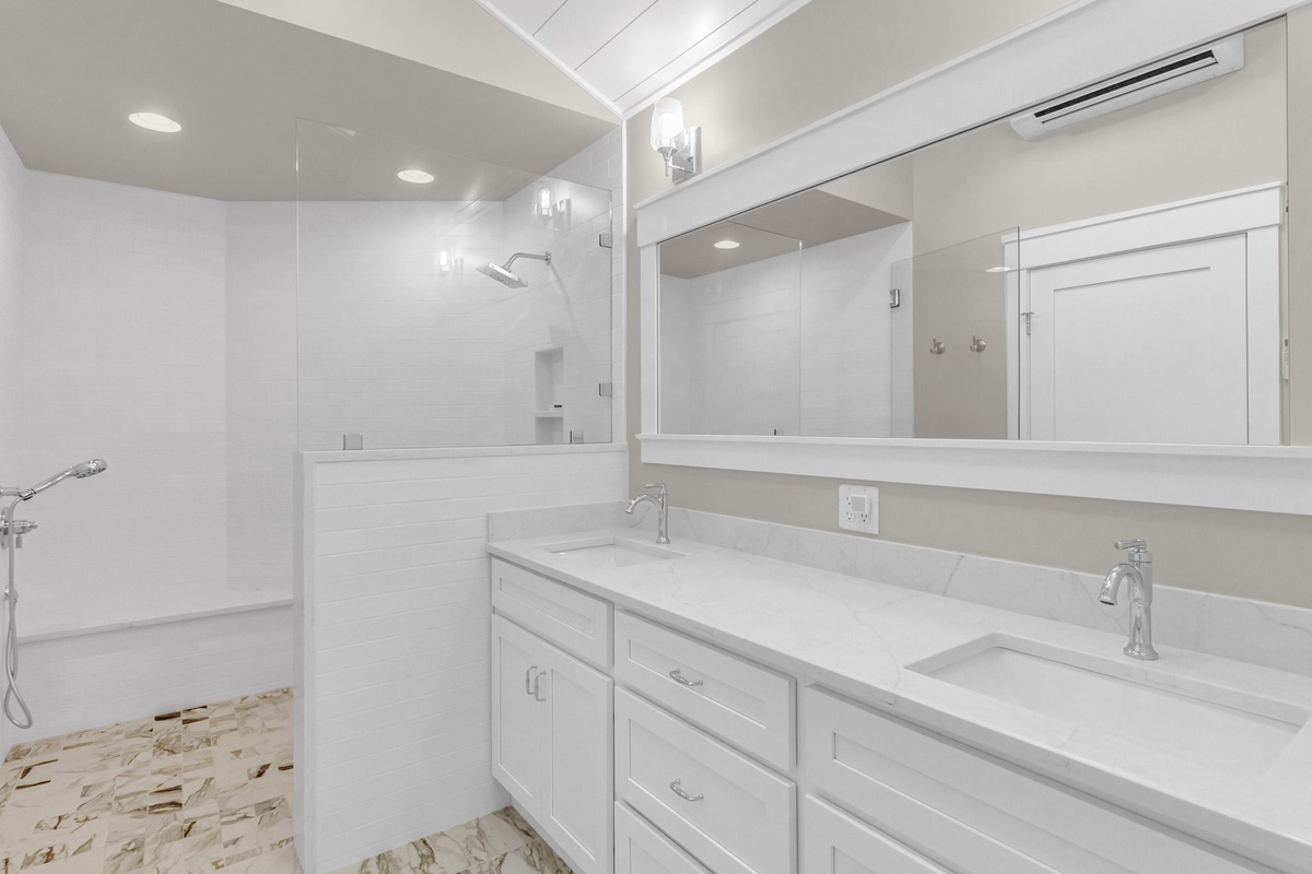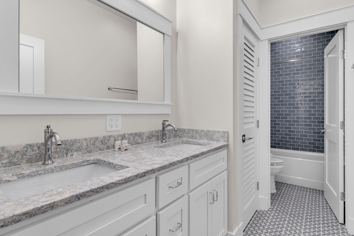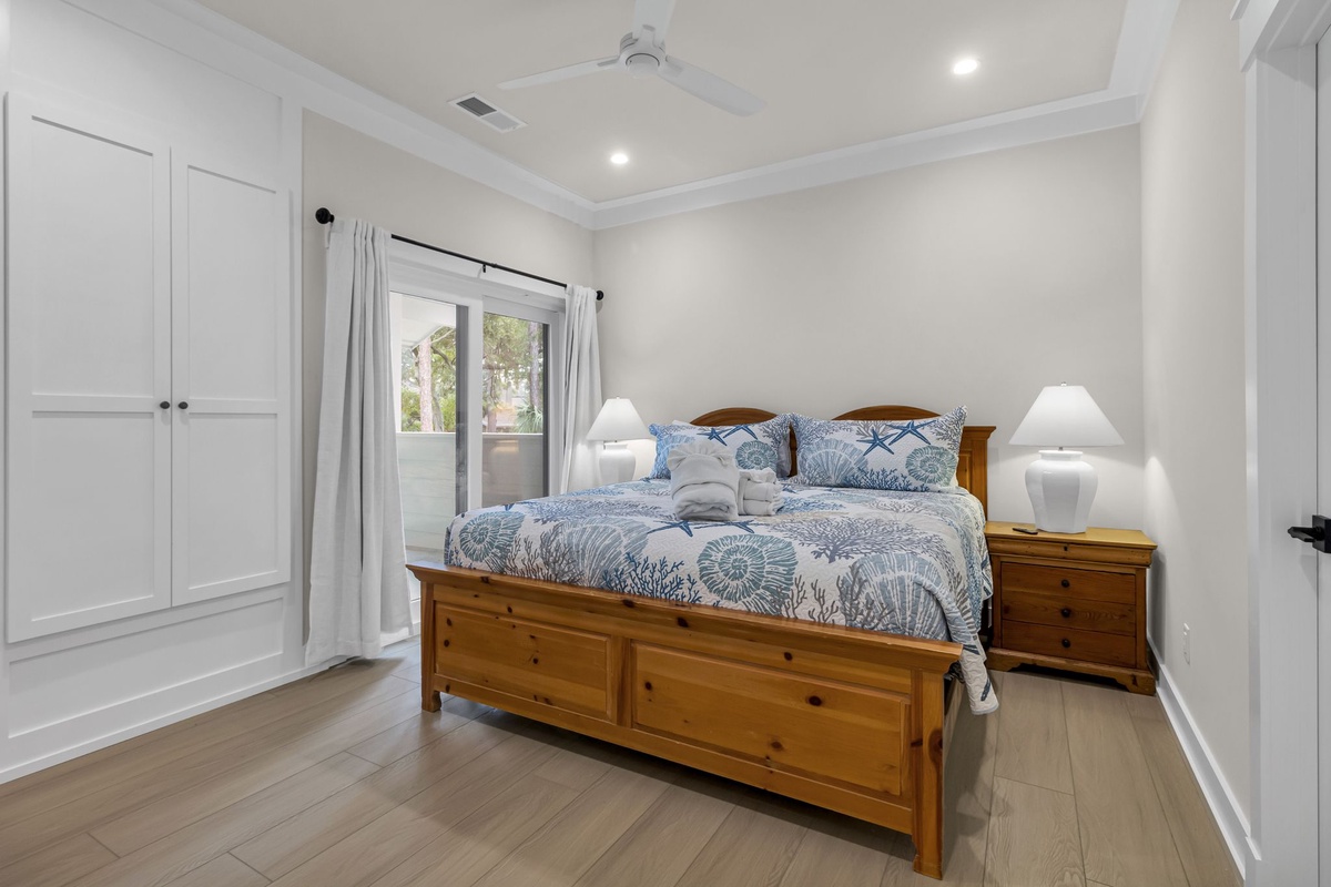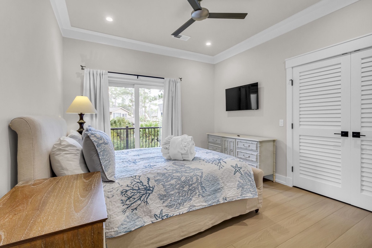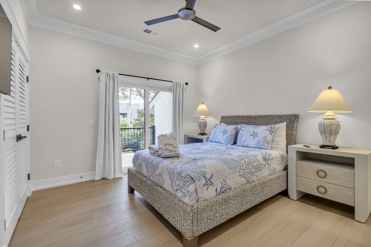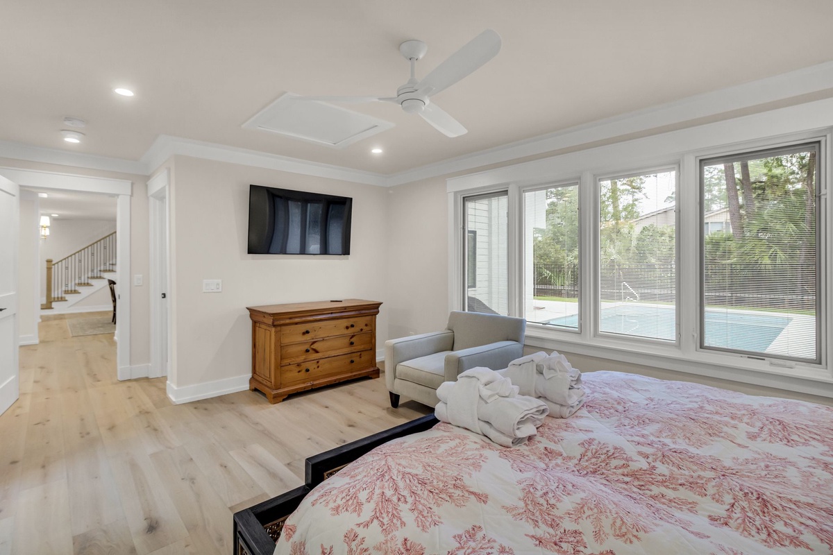 The remaining guest rooms can all be found upstairs, each with their own special amenity. A pair of bookending bedroooms along one hall share a wide elevated patio overlooking the pool deck. Each has a ceiling fan and flat-screen TV, while one enjoys an ensuite bath with dual-basin vanity and walk-in shower. The other enjoys access to a full bath with dual-basin vanity, tub and shower.