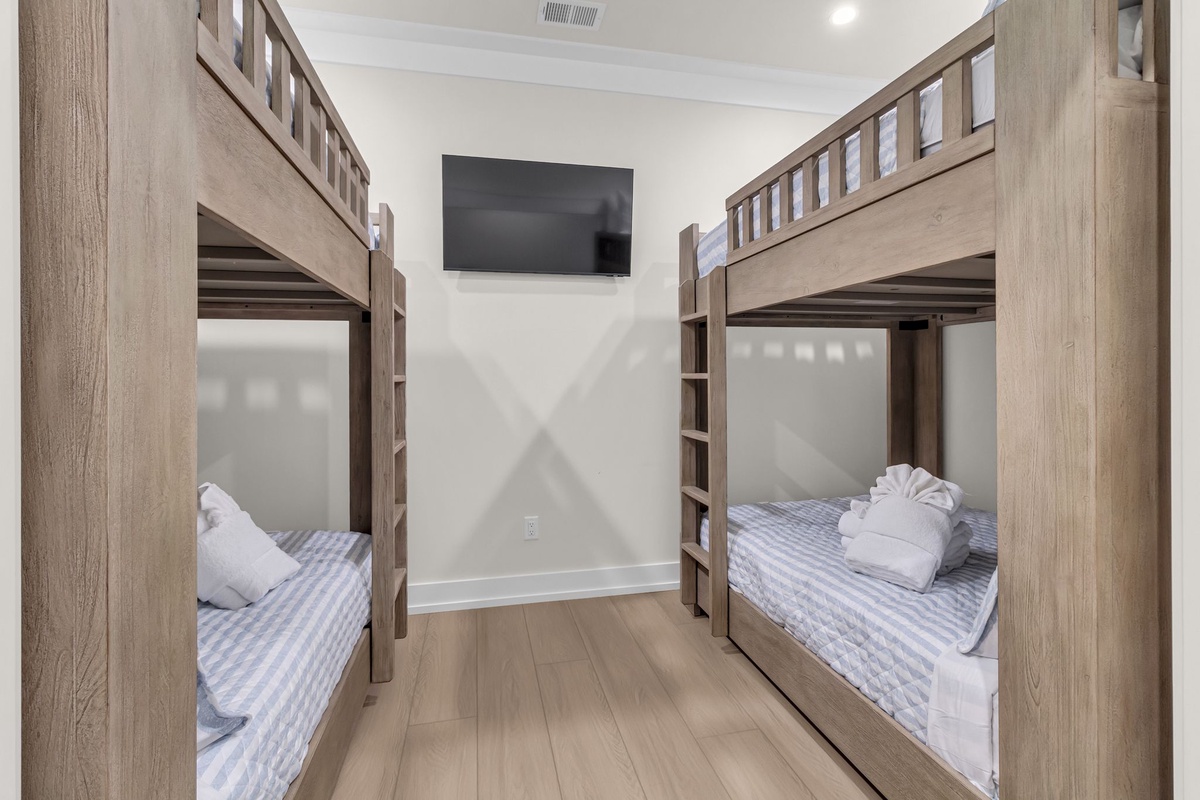 Heading past the bunk room, which flanks a flat-screen TV with two sturdy sets of bunk beds, we arrive at the upstairs primary suite. Centered around a plush king-size bed, this space enjoys a private balcony overlooking the pool, ceiling fan, flat-screen TV and ensuite bath with dual-basin vanity and walk-in shower set beneath a skylight.
