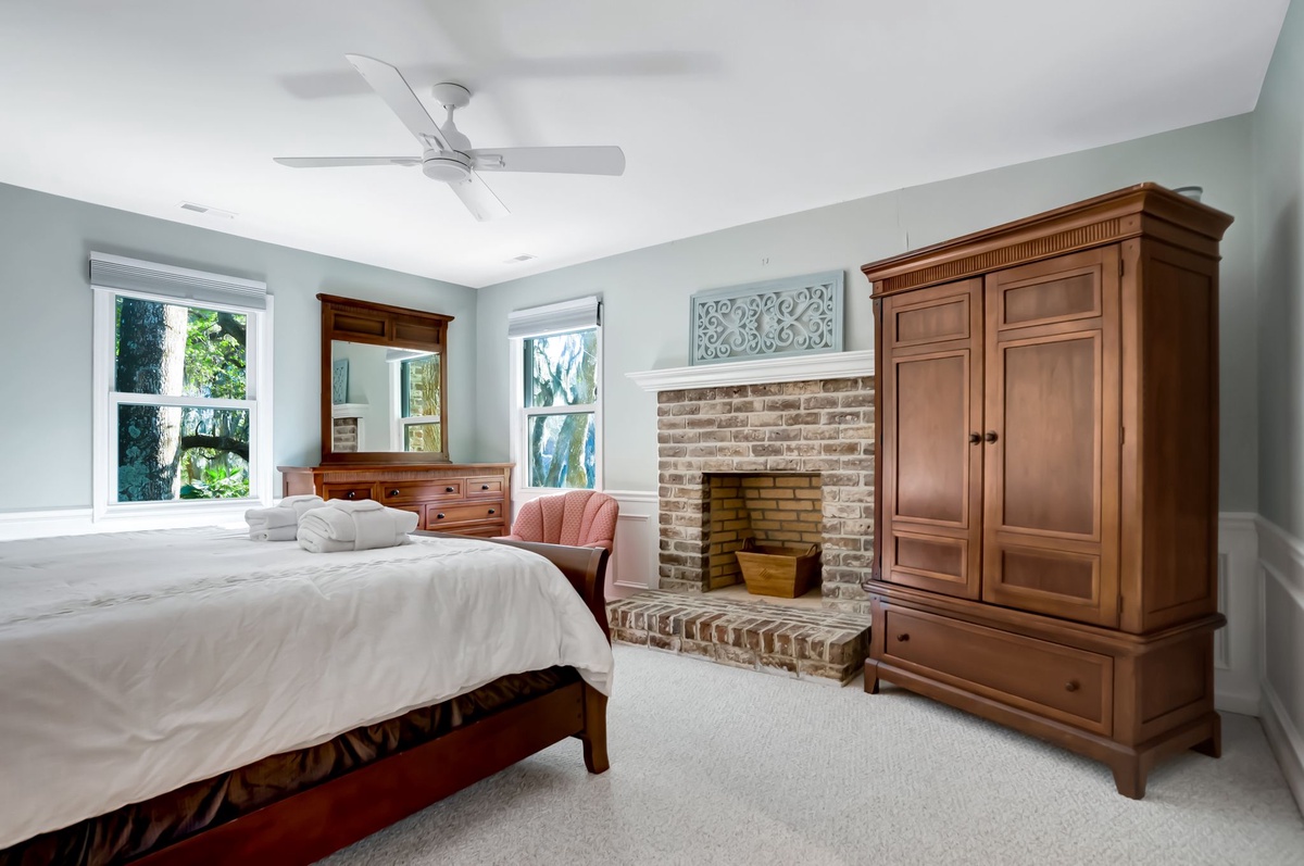 Finally, the master suite exudes grace and comfort through custom touches like the decorative Savannah brick fireplace facing a plush king-size bed in a space with ceiling fan, flat-screen TV and spacious en suite boasting dual-basin vanity and walk-in shower.