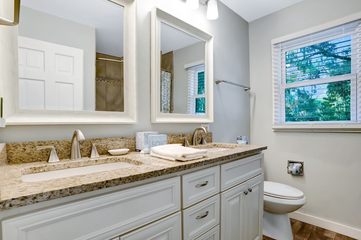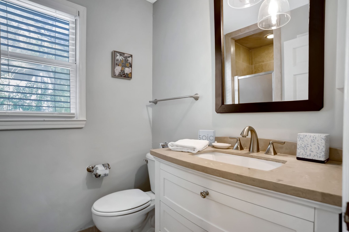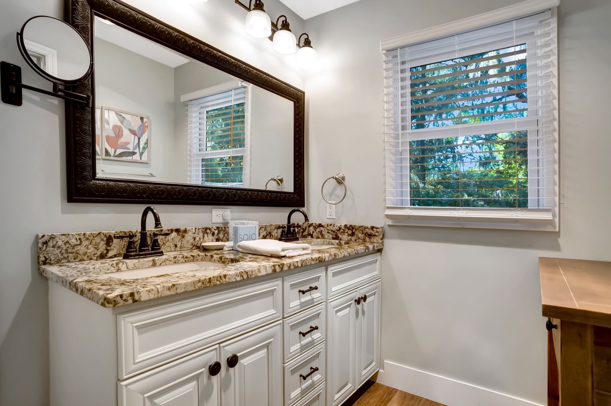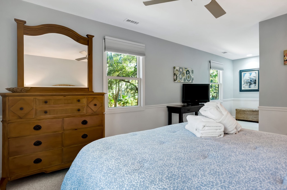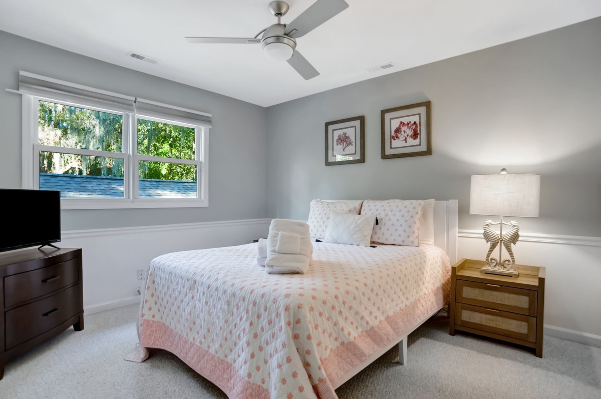The remaining guestrooms can be found up the central staircase. The first offers lush spaciousness, with a footprint that winds around to a secluded seating area and a queen bed set beneath a ceiling fan and flat-screen TV. The next sees exquisite custom millwork adding class and sophistication to a space with queen size bed, flat-screen TV and ceiling fan. These guest rooms share access to an expansive private bath with dual-basin vanity, tub and shower.