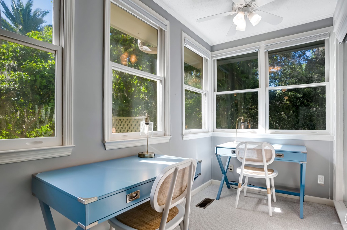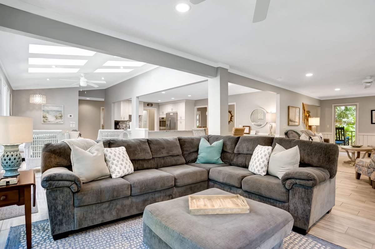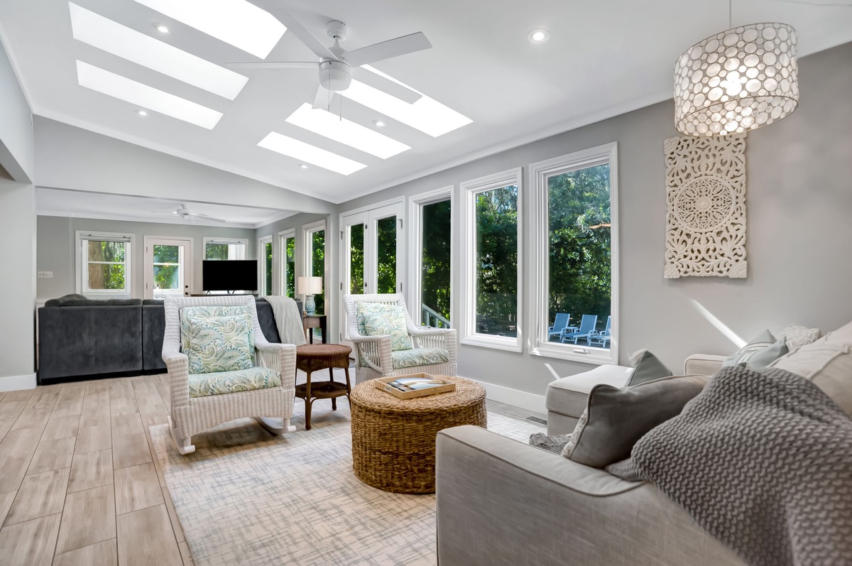 Another more informal living room nearby sees a sectional sofa set amid a panorama of windows and facing a flat-screen TV (streaming ONLY). Nearby, a door opens to an office with two wide desks and a double sized Murphy bed. The open floor plan continues to the kitchen and dining area, which sees informal dining for four in the round beside a comfortable lounge area with chaise sofa beneath skylights.